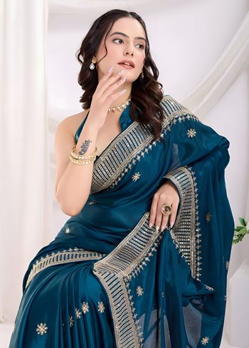 Teal Chinon Silk Saree with C-Pallu All Over Embroidery and Sequins Work