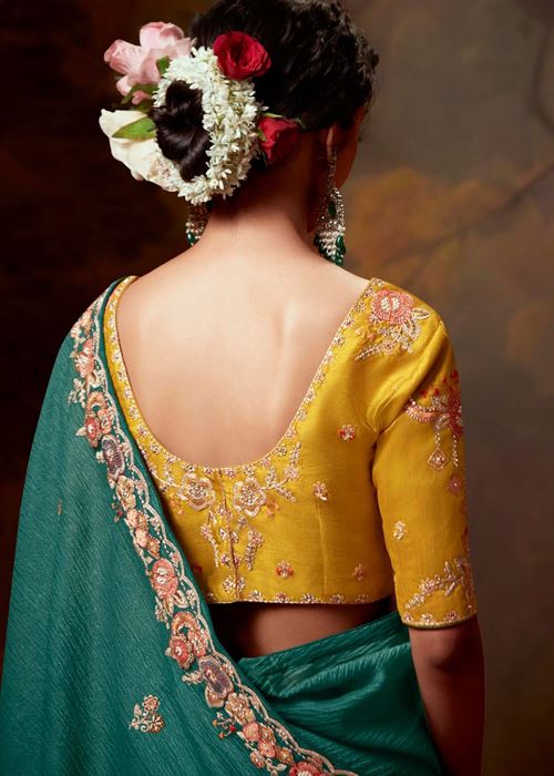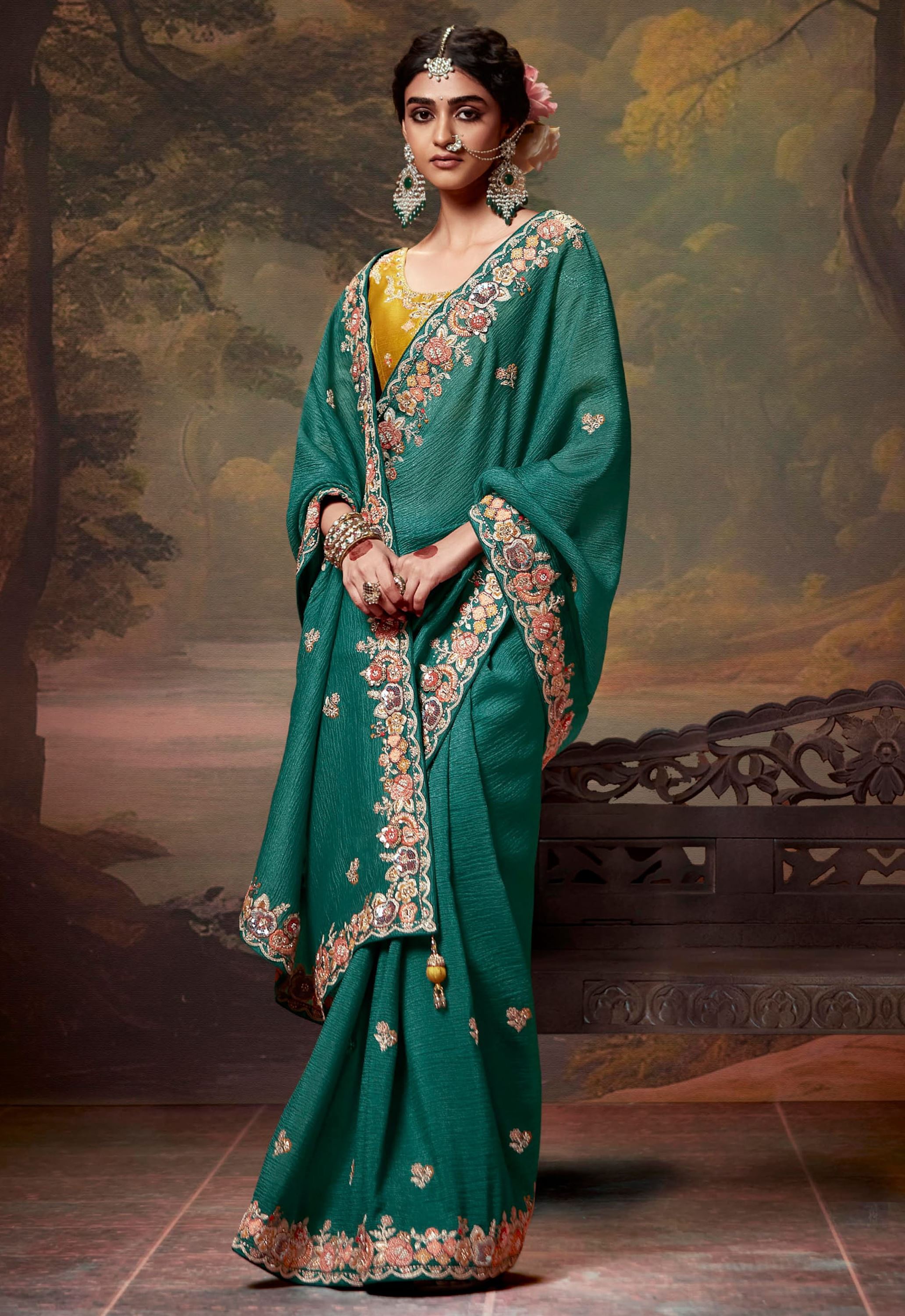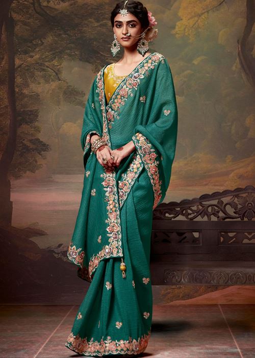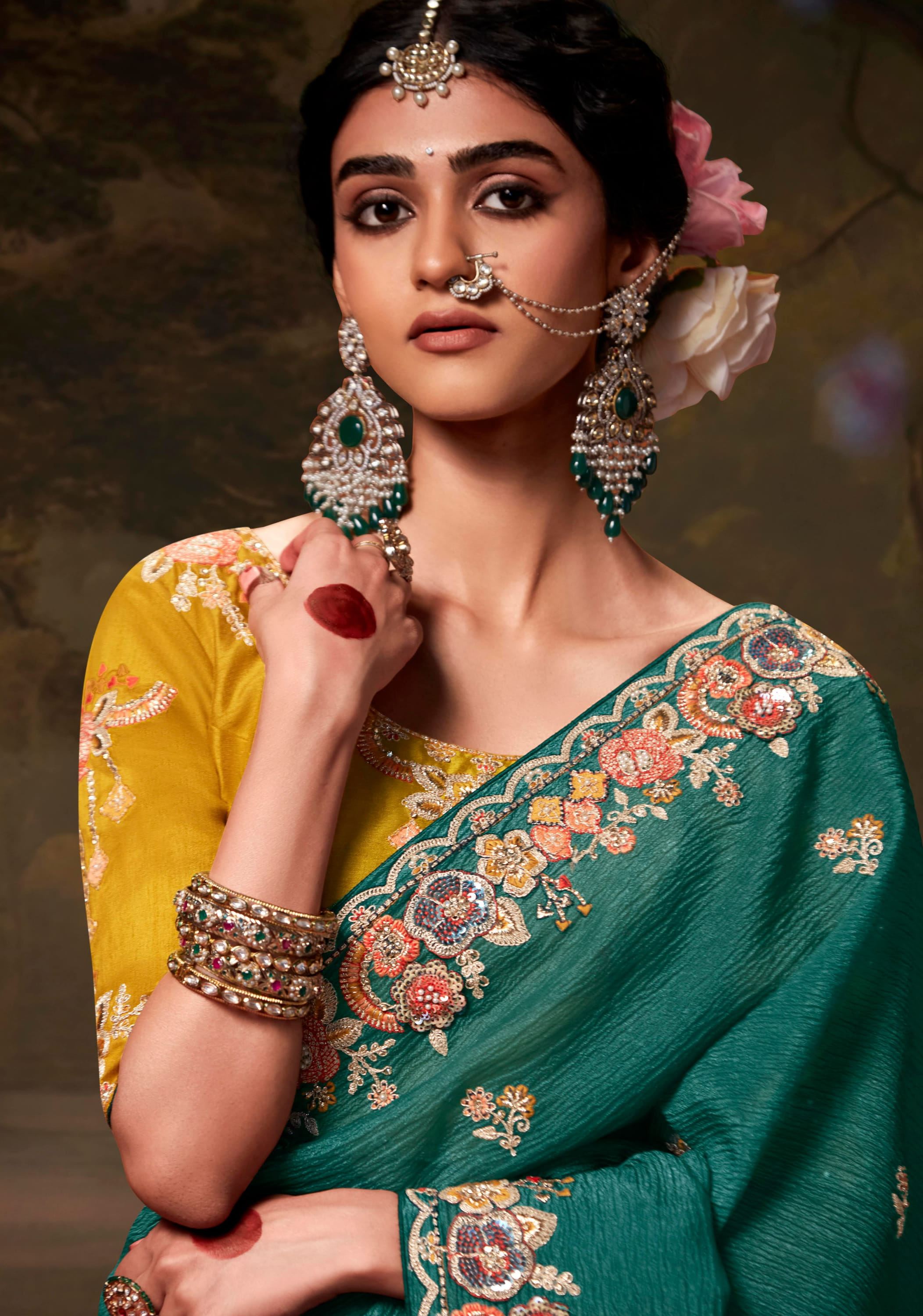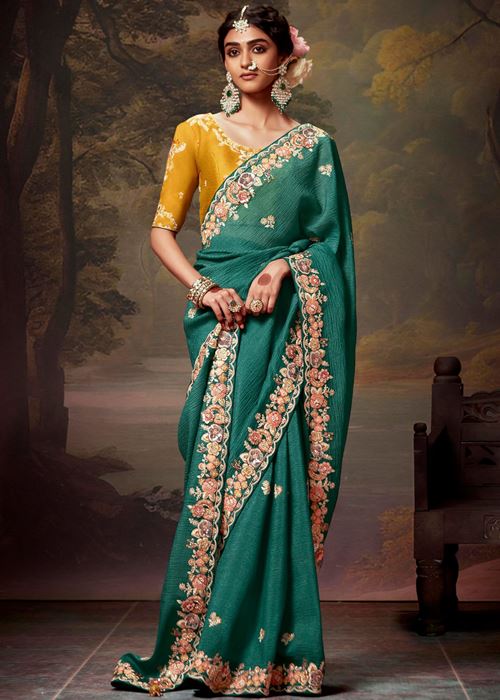 Teal Green Saree with Heavy Thread Embroidery Sequins Work and Embroidery Blouse
