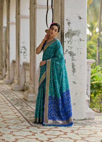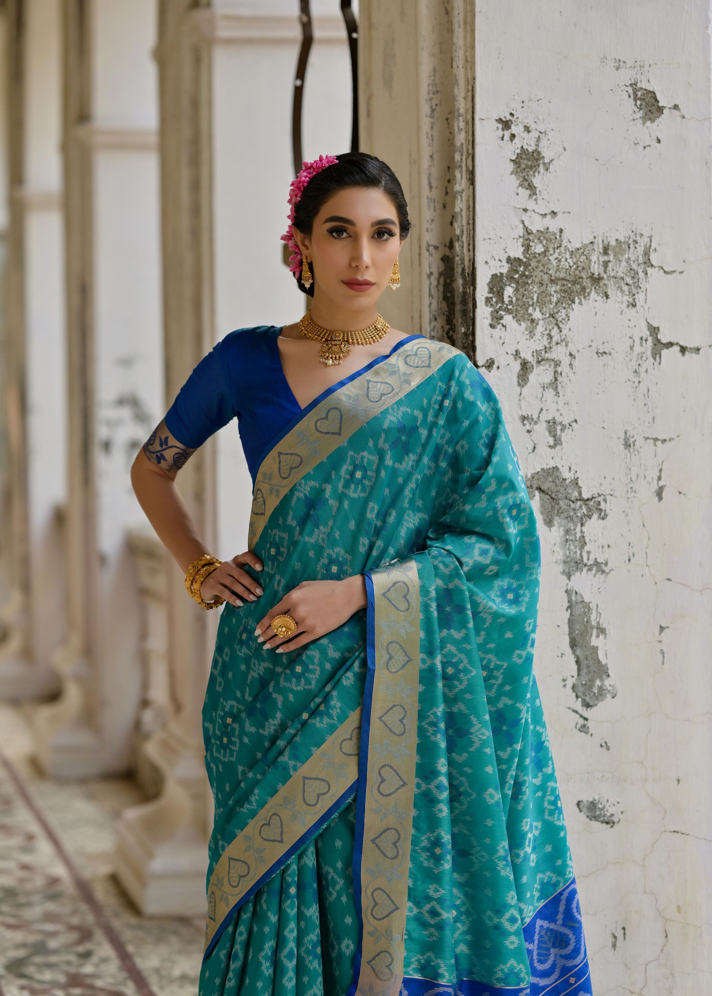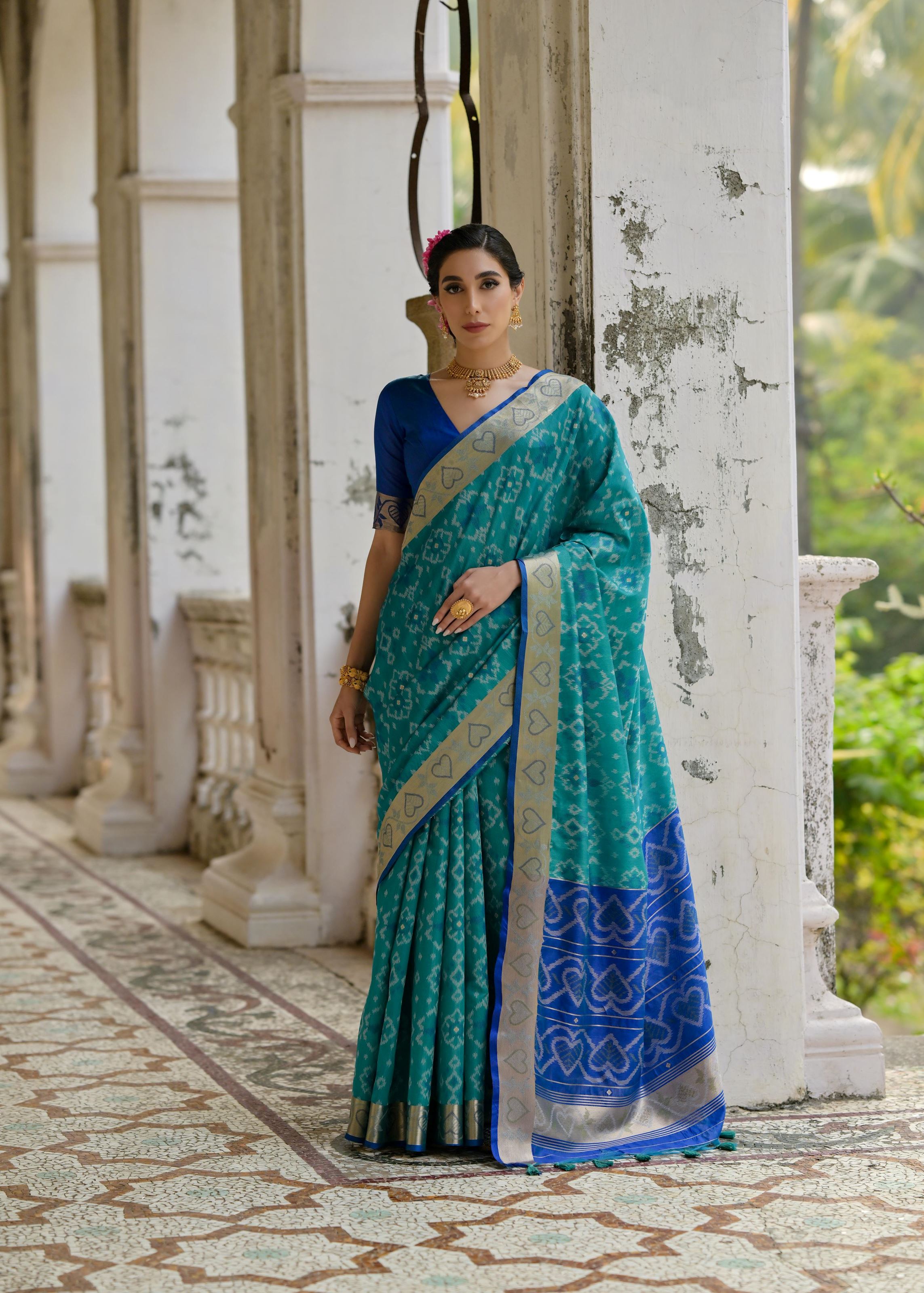 Teal Raw Silk Woven Ikat Designer Ceremonial Saree