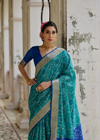 Elevate your festive wardrobe with this Teal Raw Silk Woven Ikat Designer Ceremonial Saree from Aethnofit Fashions. Crafted in a premium silk blend, the saree showcases the richness of woven Ikat artistry that brings together traditional weaving techniques with a contemporary touch. The vibrant teal shade adds an aura of sophistication, while the contrasting blue silk blend blouse perfectly complements the ensemble, creating a graceful and timeless appeal.