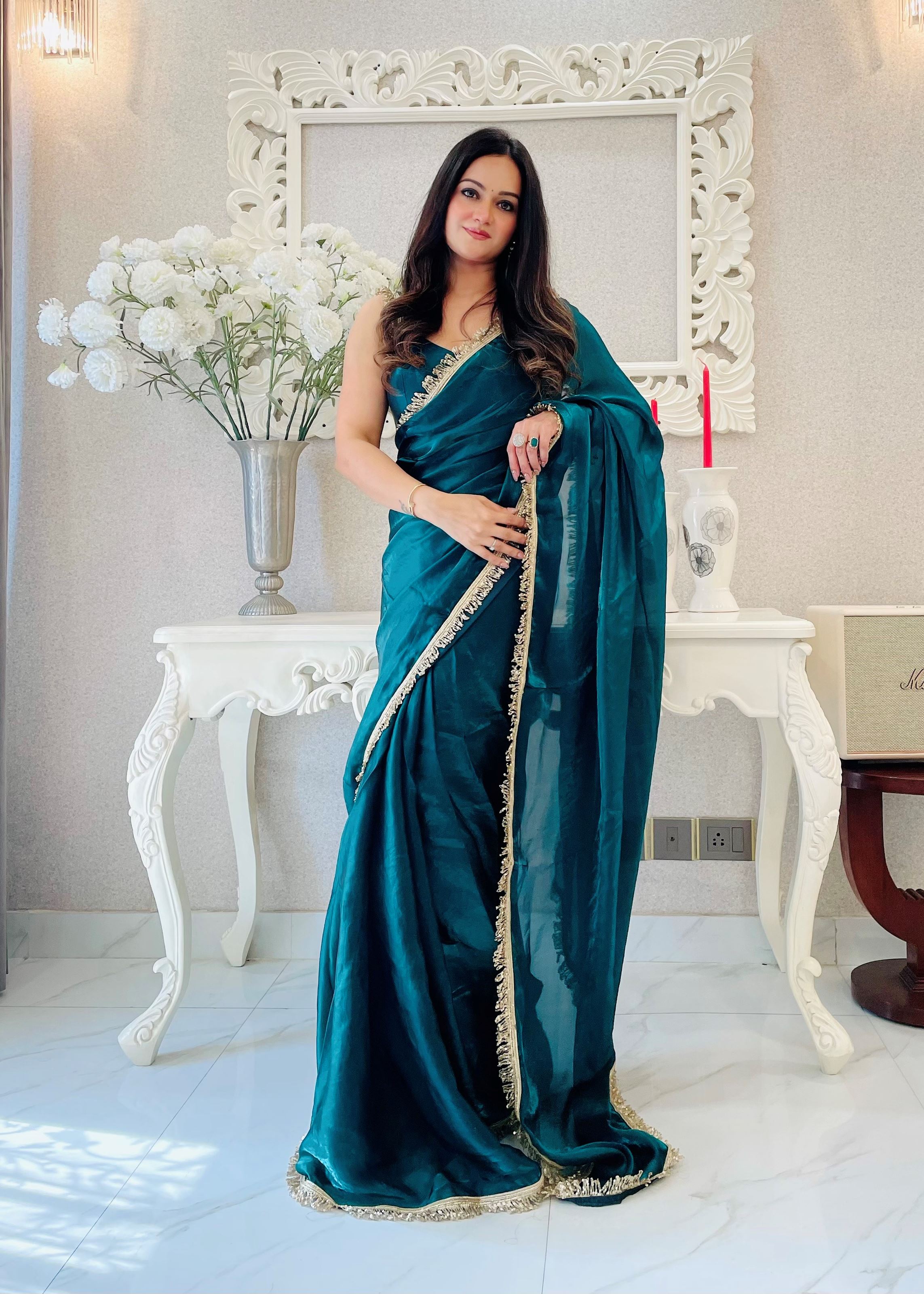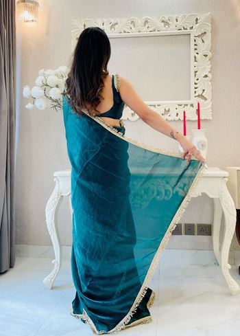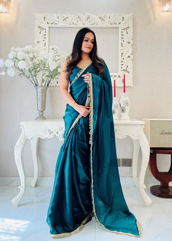 Teal Ready To Wear Fendy Satin Saree Designed With Lace Border