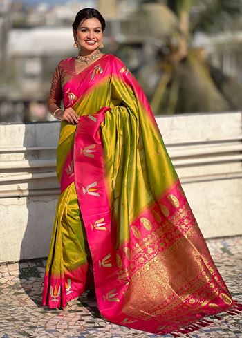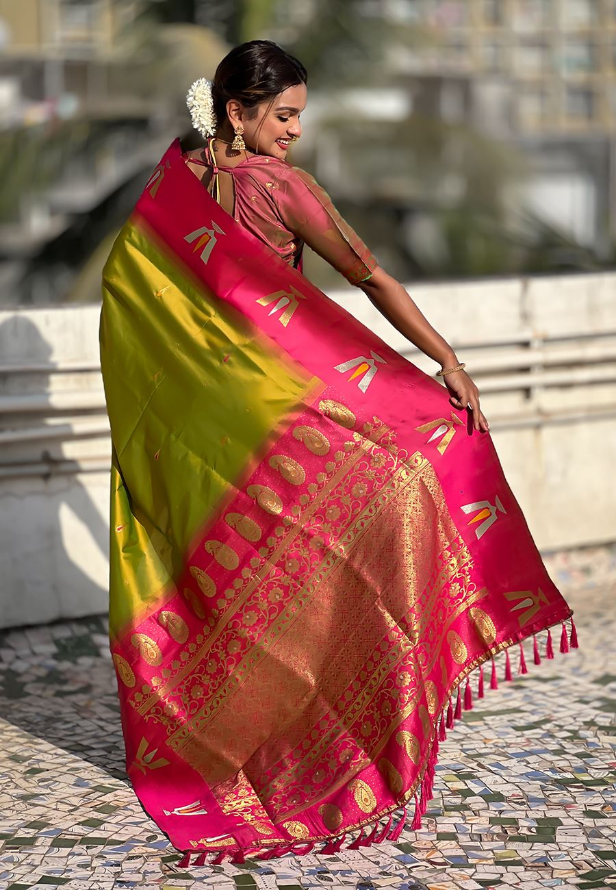 This saree comes with a contrasting pink silk blend blouse for a striking and fashionable look. The unstitched blouse allows for customization, so you can tailor it to your desired style. Pair it with traditional jewelry, statement earrings, and a classic clutch to complete your festive look.Shop authentic woven silk sarees online at Aethnofit Fashions and enjoy premium quality with worldwide shipping. Whether for weddings, receptions, or festive occasions, this Mahendi silk saree is a must-have addition to your collection. Order now and step into any celebration with grace and style!