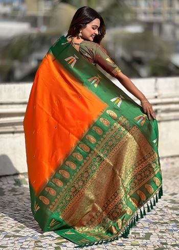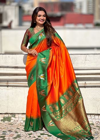 The saree is paired with a green silk blend blouse, creating a striking contrast that enhances the overall appeal of the outfit. The blouse fabric is unstitched, allowing customization for a perfect fit that complements your unique style. Pair it with traditional jewelry, bangles, and a statement clutch to complete your ethnic look.Shop premium woven silk sarees online at Aethnofit Fashions with worldwide delivery. This orange silk saree is ideal for those who love classic tradition with a modern touch. Order today and elevate your festive fashion!