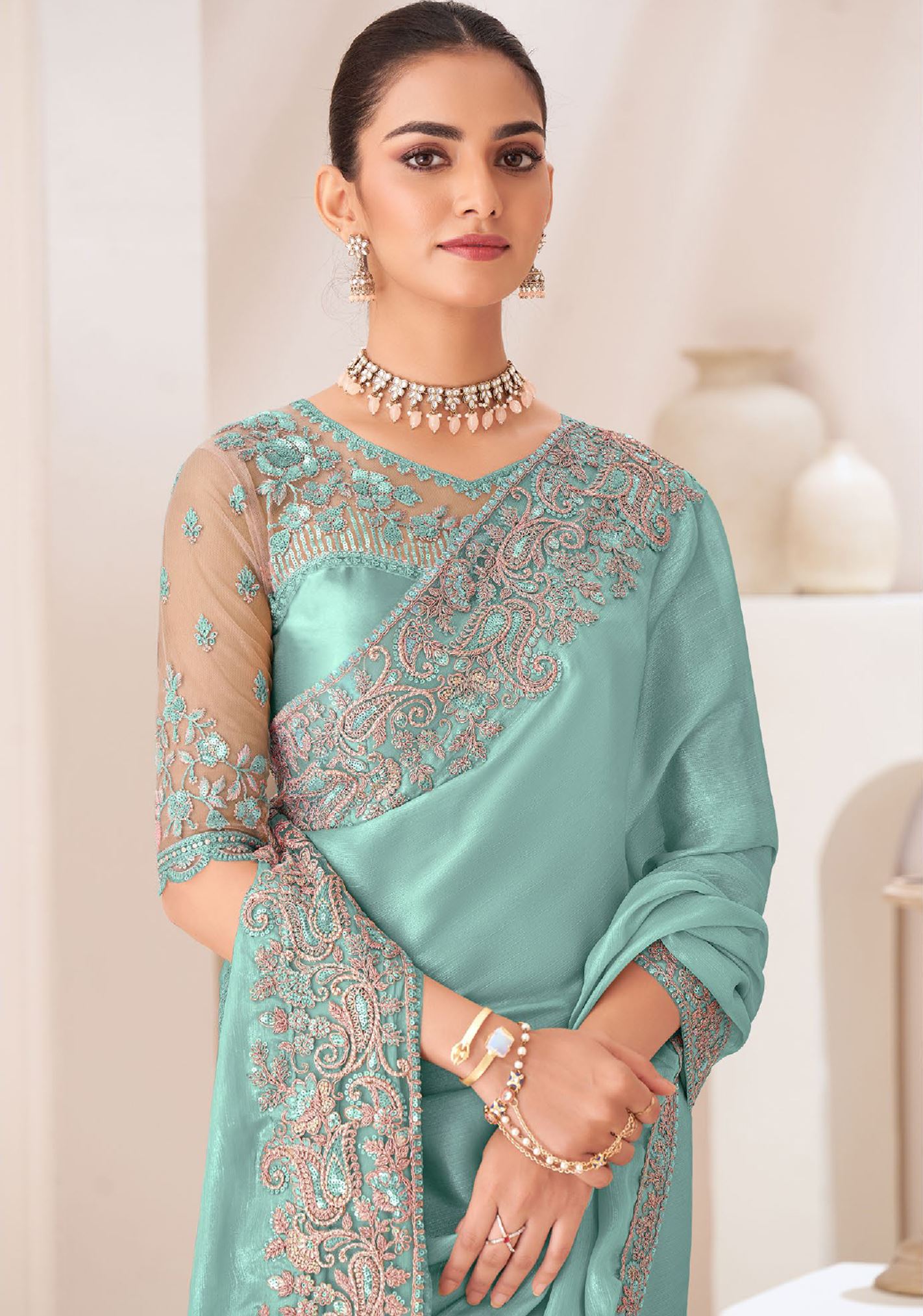Turquoise Saree With Heavy Embroidered Work