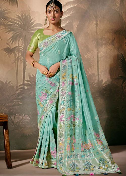 Turquoise Silk Saree With Jacquard Woven