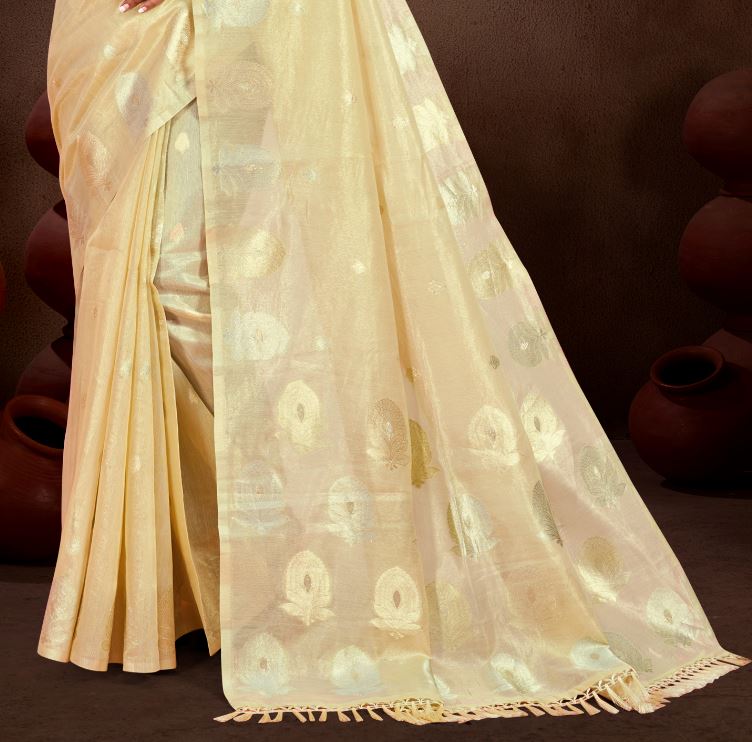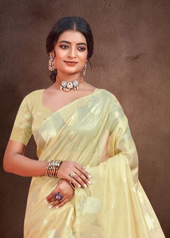 The rich golden hue symbolizes prosperity and joy, making it an ideal choice for weddings, festive rituals, and grand celebrations. Paired with a matching Munga Kota blouse, the ensemble exudes harmony and grace, while its airy texture ensures effortless draping and all-day ease. Style it with traditional temple jewellery for a regal look or contemporary accessories for a chic twist.
