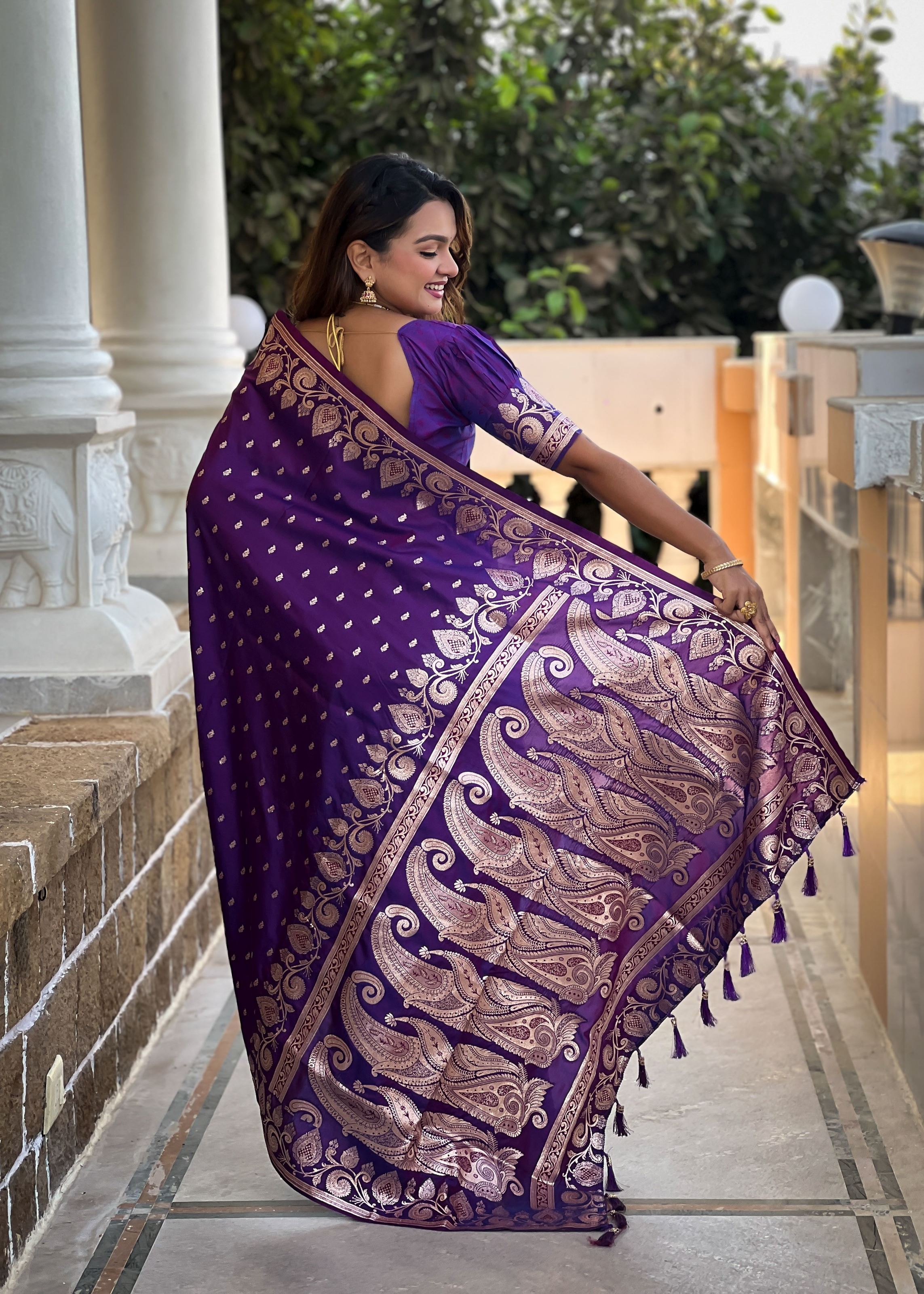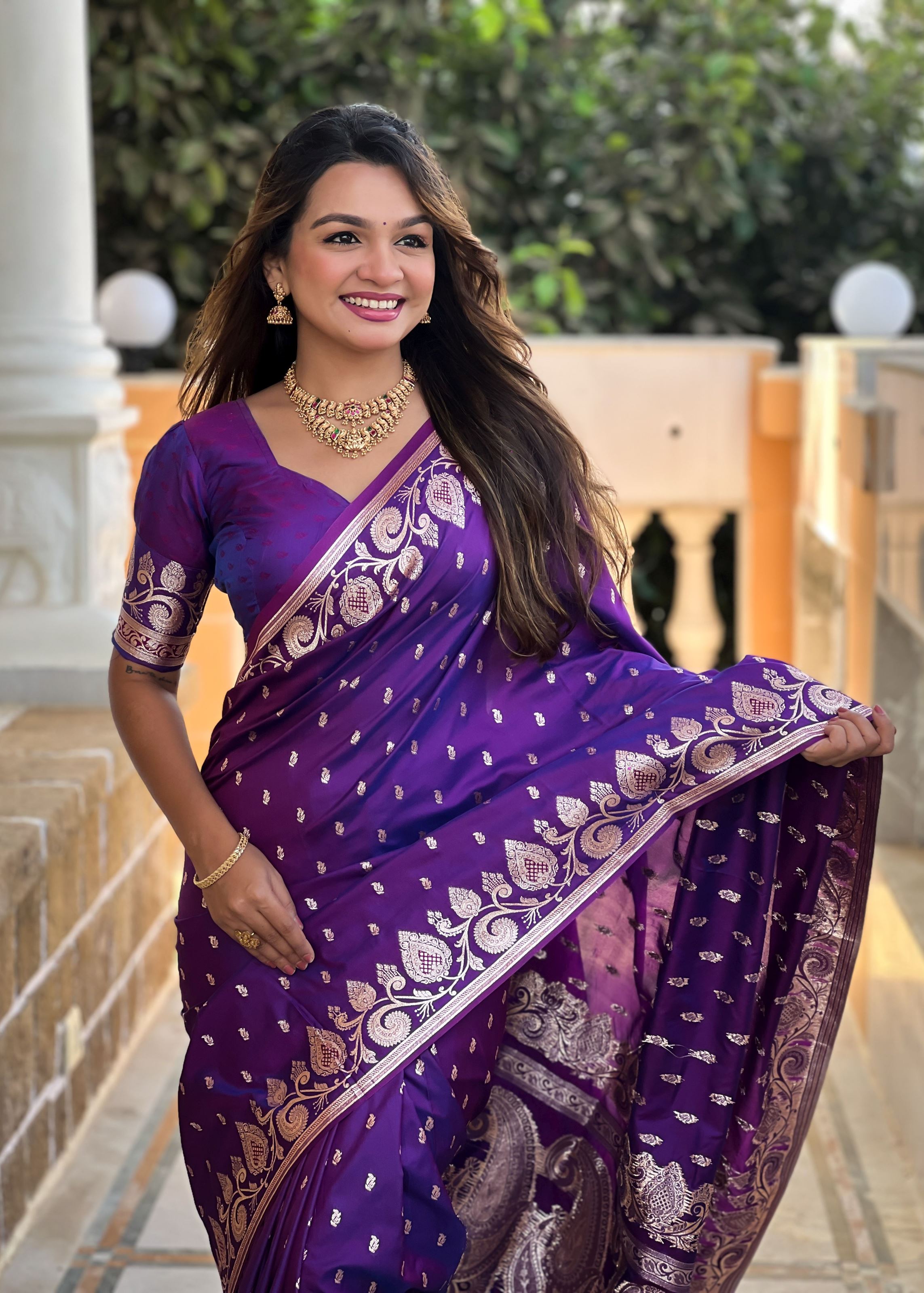 Violet Banarasi Silk Saree With Woven Jacquard Designer Partywear Saree