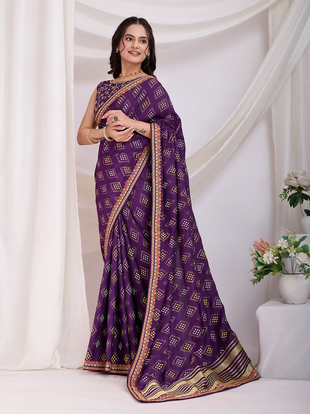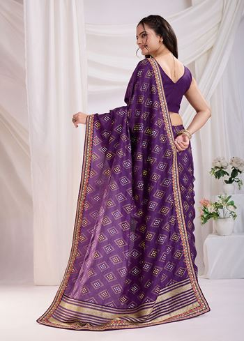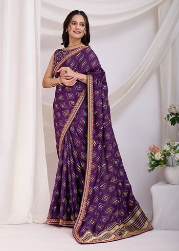Violet Beautiful Bandhej Printed With Embroidery Work Vichitra Silk Saree