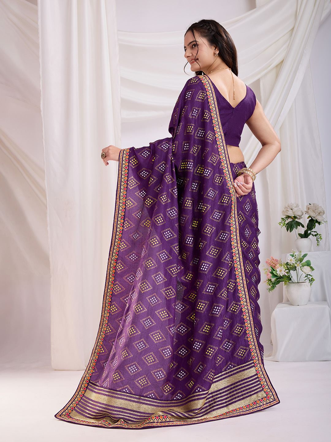 Elevate your ethnic wardrobe with this exquisite Violet Bandhej Printed Vichitra Silk Saree, a blend of timeless tradition and modern elegance. Crafted from premium art silk fabric, this saree offers a smooth texture and graceful fall, making it perfect for ceremonial and festive occasions. The enchanting violet shade adds a royal charm, symbolizing grace and sophistication, while ensuring you stand out at weddings, family gatherings, and festive celebrations.