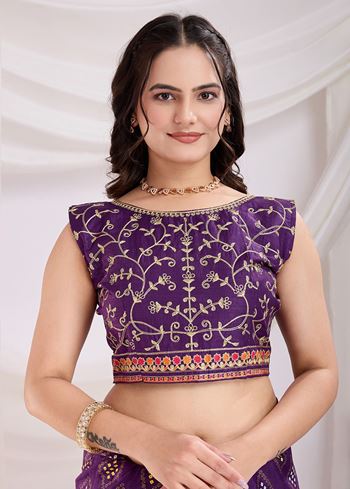 Paired with a matching violet art silk blouse, the set gives you versatility—whether you prefer a simple, elegant style or a heavily embellished look for grand occasions.Style this saree with statement jewelry such as kundan chokers, traditional bangles, and embellished footwear for a complete festive look. Perfect for weddings, festive gatherings, or cultural events, this saree embodies heritage, elegance, and sophistication in every detail.
