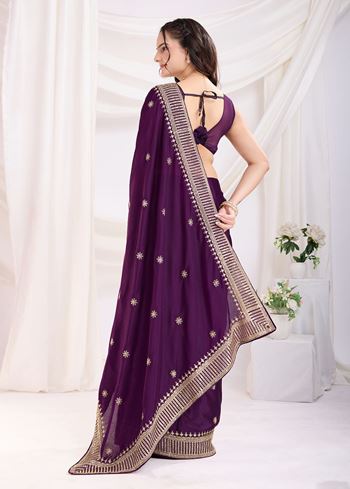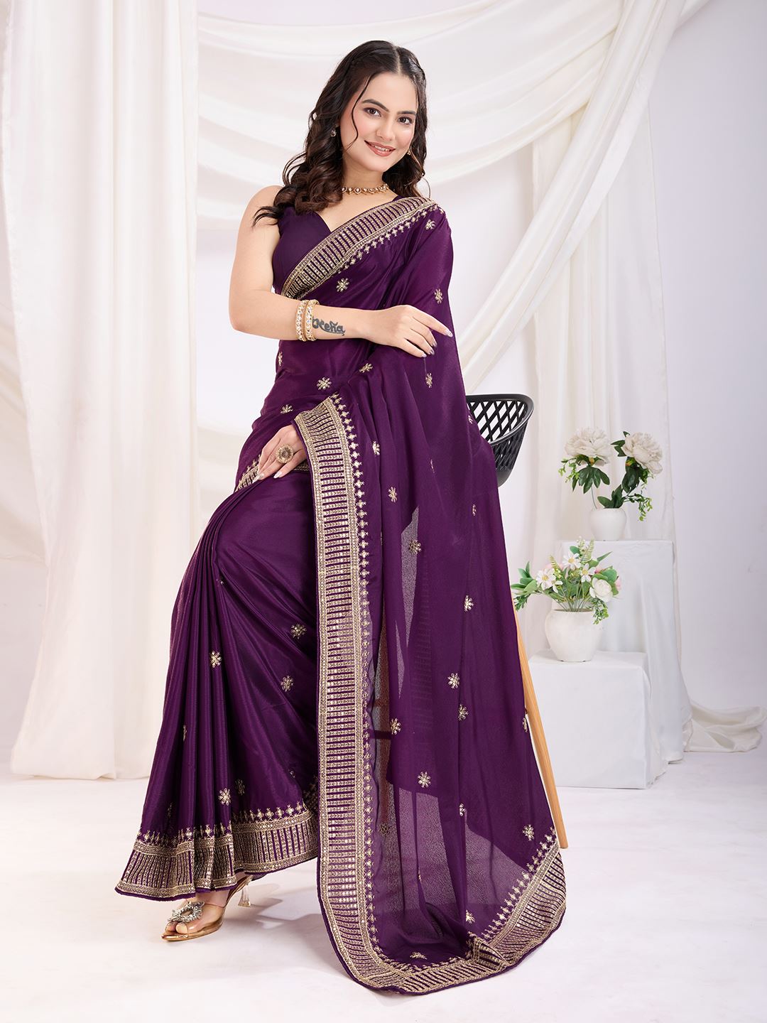 Violet Chinon Silk Designer Zari Embroidered Ceremonial Saree