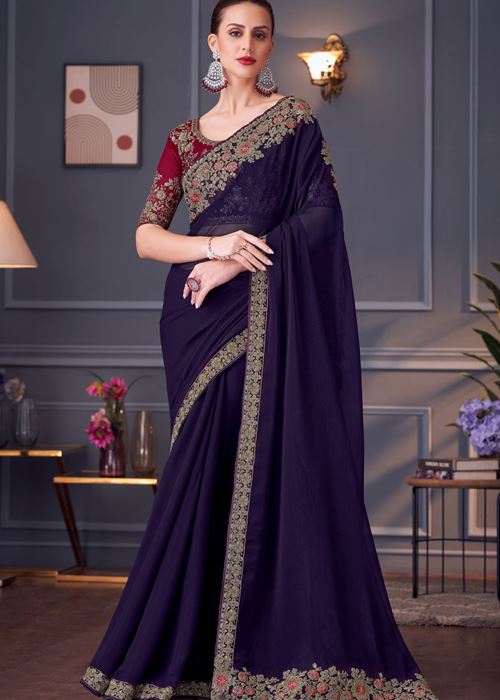 Violet Saree With Heavy Thread Embroidery Sequins Work