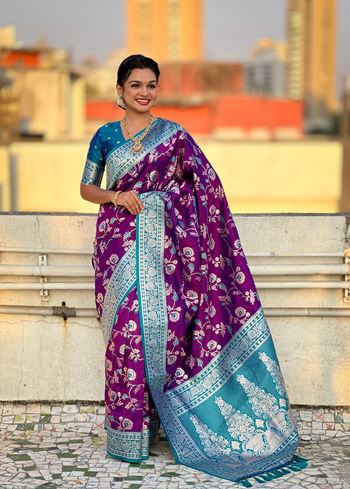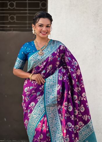 Voilet Banarasi Silk Weaving Meenakari Designer Heavy Looks Saree