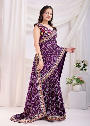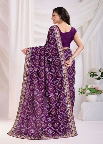 Voilet Bandhani Printed With Embroidery Work Beautiful Ceremonial Saree