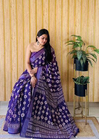 Voilet Linen Cotton Digital Batik Printed Traditional Looks Saree
