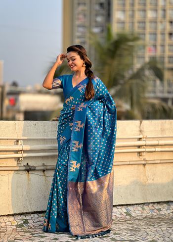 Paired with a matching silk blouse, this designer saree delivers a complete, polished look. Its intricate woven work reflects traditional Indian craftsmanship, highlighting the artistry and attention to detail of skilled artisans. Ideal for brides, party-goers, or anyone seeking elegant ethnic wear, this saree blends classic tradition with modern style.