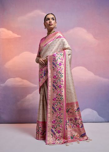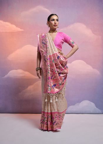 A beautifully contrasting pink Paithani silk blouse accompanies the saree, adding a soft yet striking balance to the overall ensemble. The silk fabric ensures a graceful drape and luxurious feel, making it perfect for bridal events, festive gatherings, temple visits, or milestone celebrations. The combination of subtle color and intricate detail offers a perfect fusion of minimalism and grandeur.