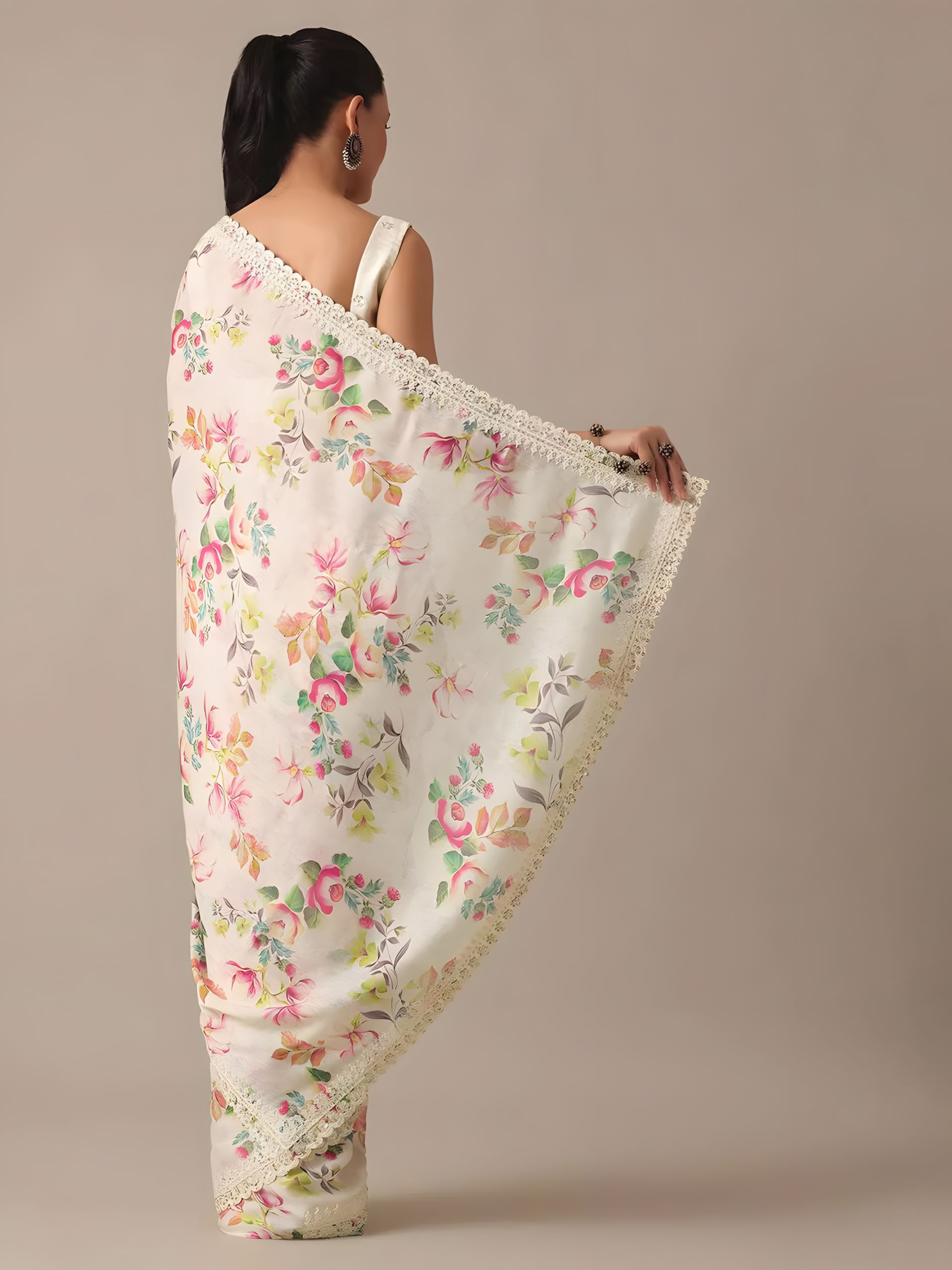 White Pure Soft Georgette Chiffon Saree with Digital Print