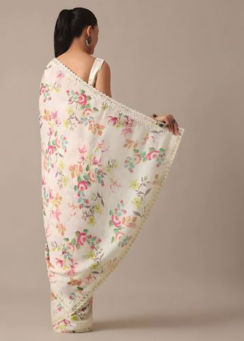 The pristine white tone is versatile and seasonless, perfect for daytime celebrations, resort-style gatherings, and elegant casual wear. It comes with a matching white blouse made from structured Mono Banglory fabric, which provides a crisp finish to contrast beautifully with the saree’s fluid texture. The digital print lends it a fresh and artistic flair, making it a standout piece for contemporary ethnic styling.