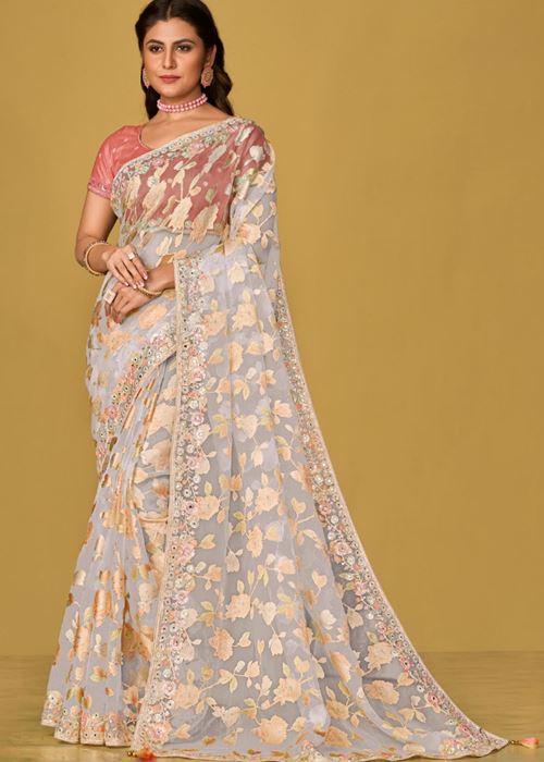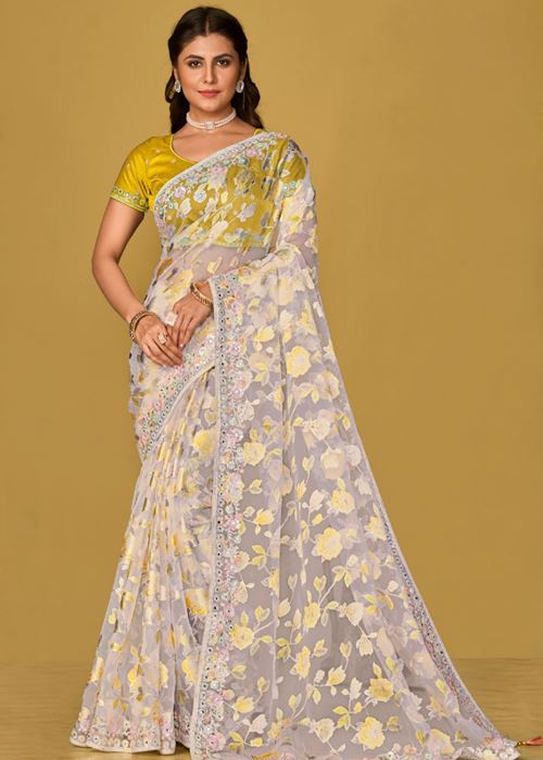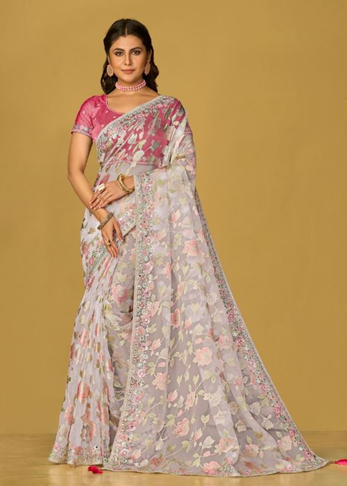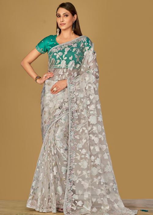 White Soft Organza Brasso Saree With Printed Saree With Piping, Embroidery Sequins Work