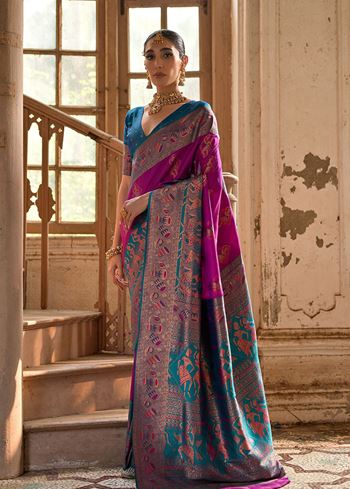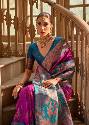 Elevate your ethnic style with the Wine Banarasi Silk Saree with Kalamkari Zari Design from Aethnofit Fashions. This stunning drape features a rich wine hue crafted in luxurious Banarasi silk, adorned with intricate Kalamkari-inspired zari motifs. The elaborate zari work brings artistic depth to the saree, while the contrasting blue Banarasi silk blouse adds a striking and contemporary edge, enhancing the overall visual harmony.