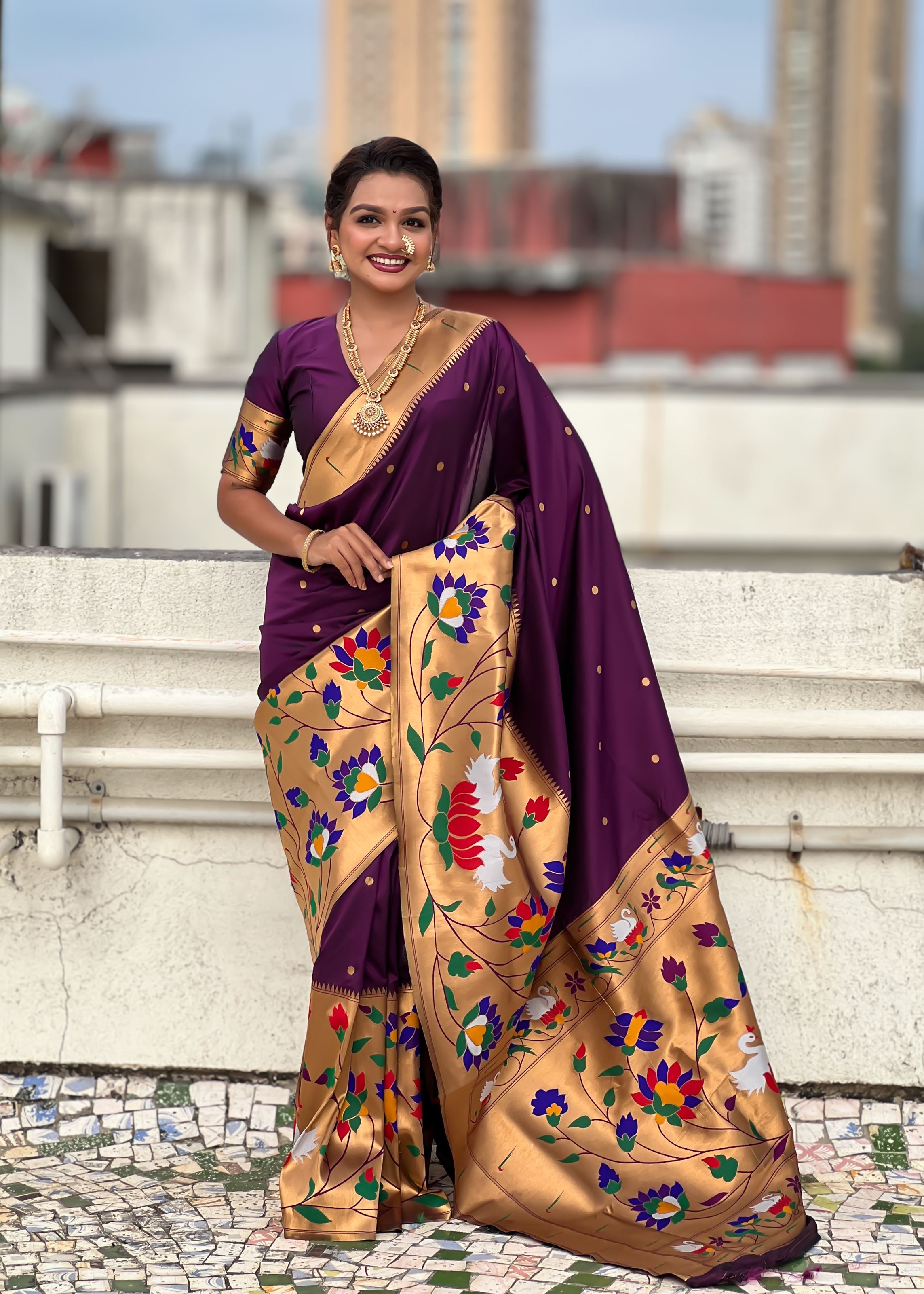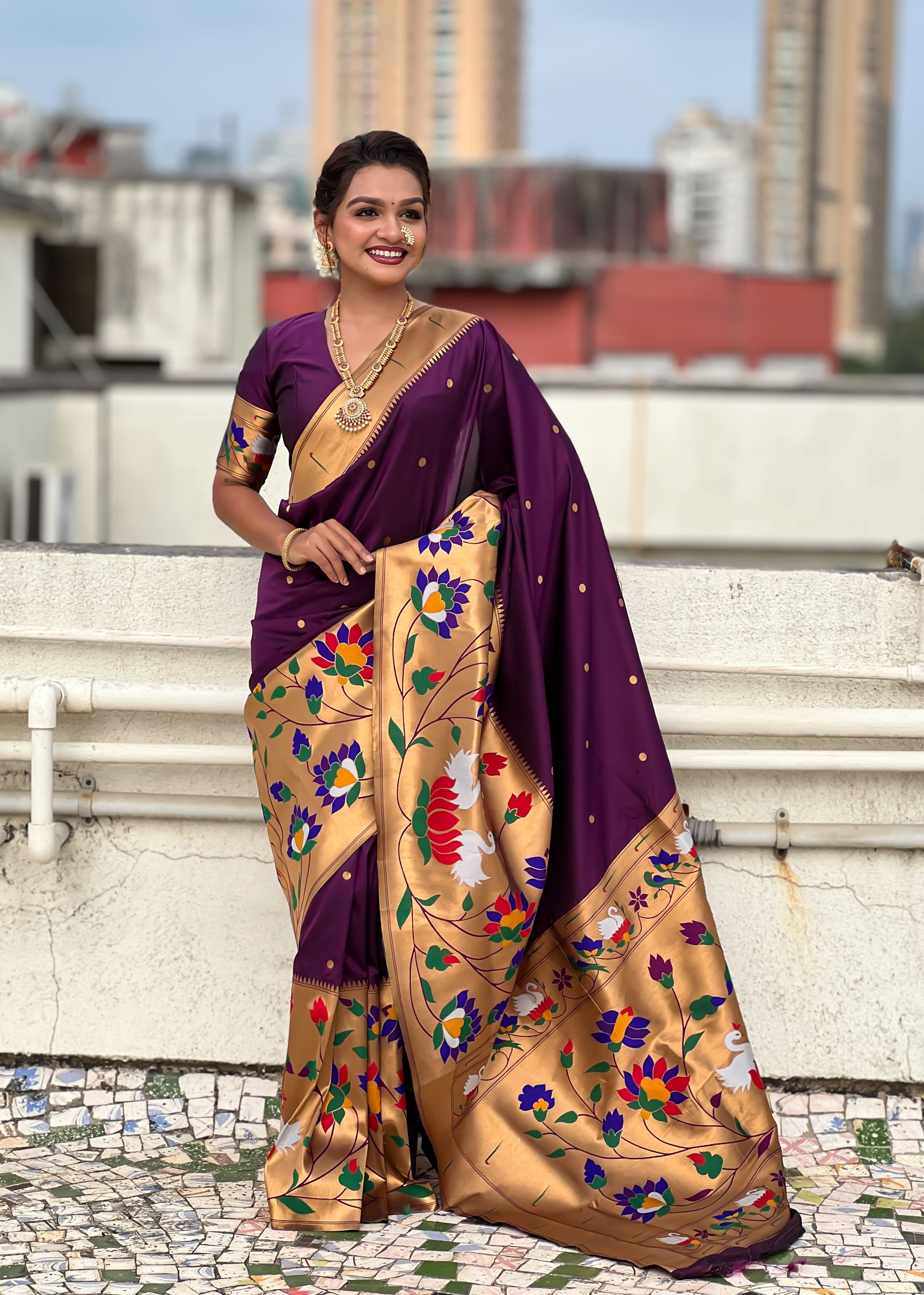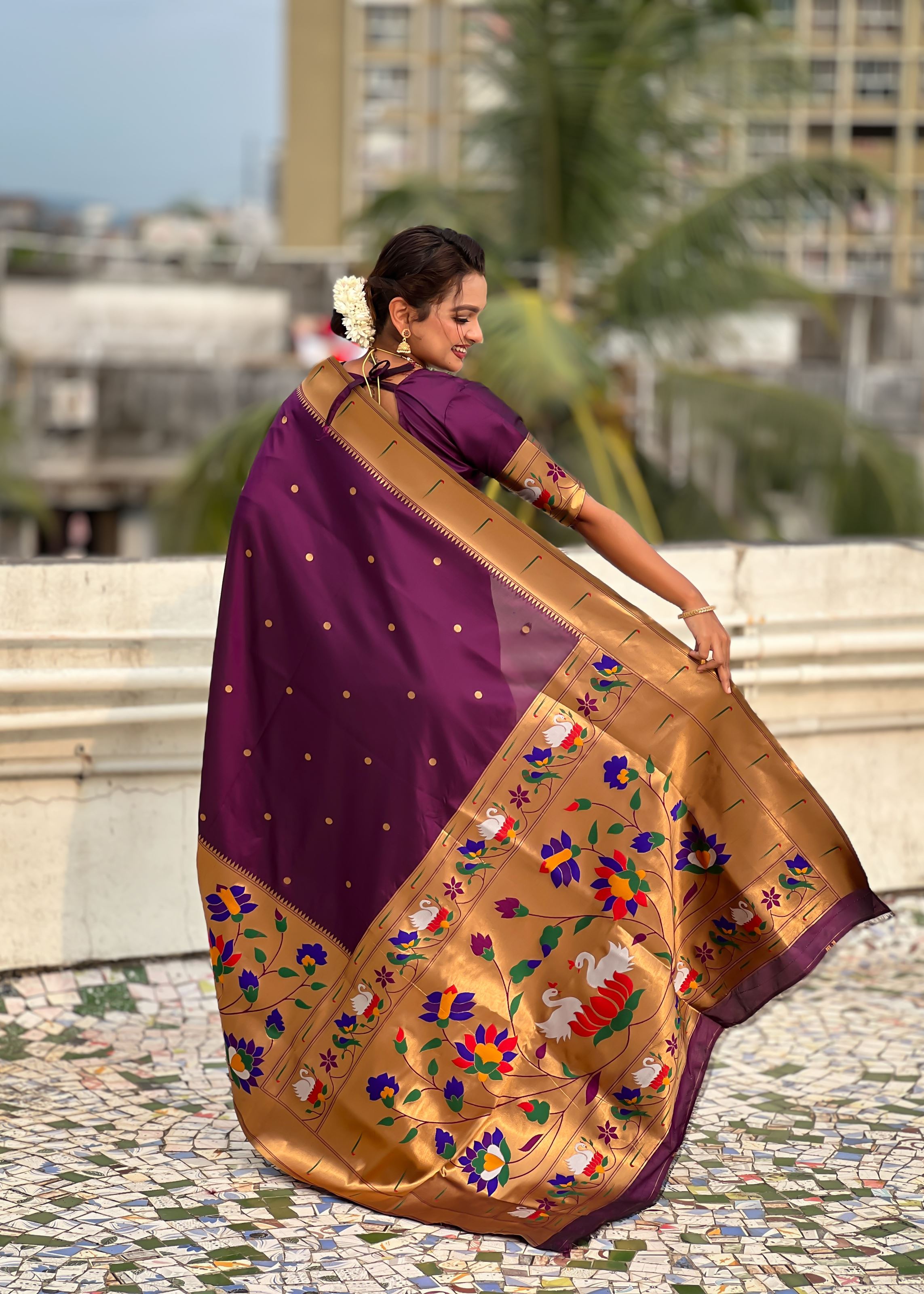 Wine Beautiful Woven Meenakari Polka Designer Paithani Silk Ethnic Graceful Saree