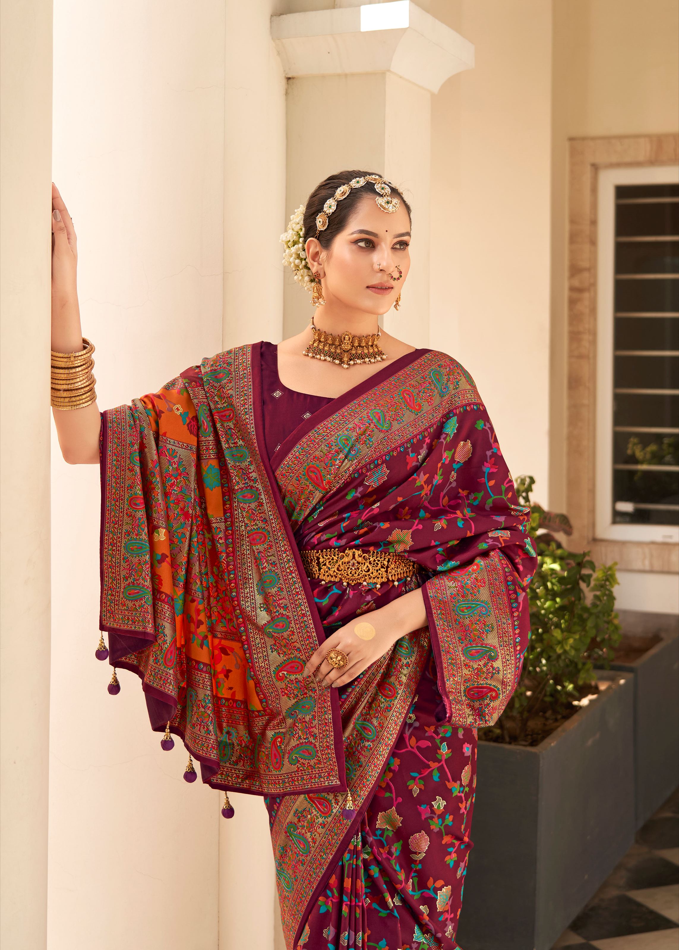 Wine Berry Velvet Tussar Silk Woven Designer With Floral Printed Ethnic Wedding Wear Saree