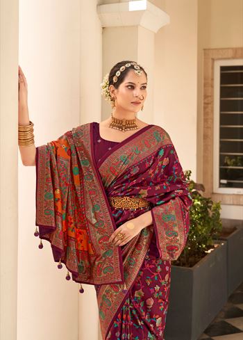 Paired with a matching wine silk blend blouse, this saree creates a polished and harmonious ensemble. Its lightweight yet sumptuous texture ensures effortless draping while maintaining a refined and majestic appearance. The intricate woven craftsmanship reflects traditional artistry, while the floral prints add a contemporary flair. Perfect for accessorizing with statement jewelry for grand events or subtle pieces for elegant gatherings, this saree offers timeless appeal and versatility.