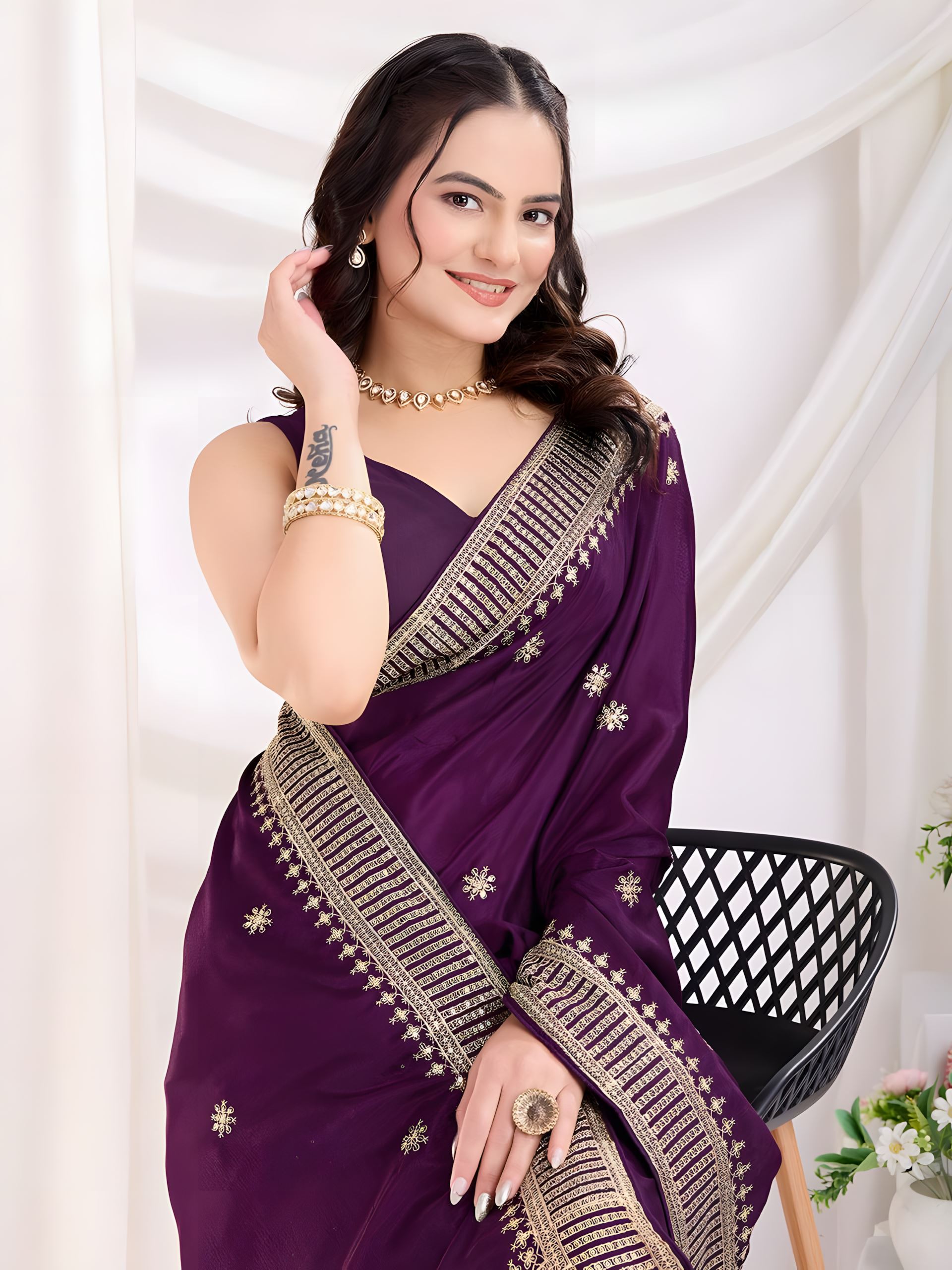 Wine Chinon Silk Saree with C pallu all Over Embroidery and Sequins Work
