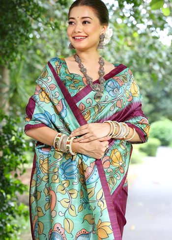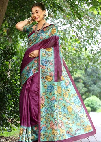 Pairing beautifully with the saree is a Rama-colored cotton silk blouse, creating a refreshing contrast that enhances the richness of the wine shade. This unexpected color pairing brings a youthful vibrancy to the look, making it ideal for modern festive celebrations, cultural functions, or graceful office wear.