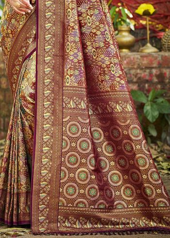 Paired with a matching wine Dharmavaram blouse, the ensemble achieves effortless harmony in color and texture. The fabric’s natural weight ensures a graceful fall while maintaining a polished, structured drape. Lightweight yet luxurious, it is ideal for women seeking wearable tradition with a modern sensibility.