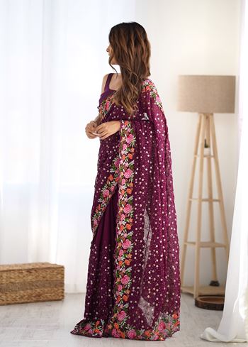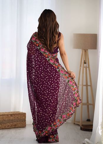 Wine Georgette Fabric Designer Sequins Work Embroidery Saree