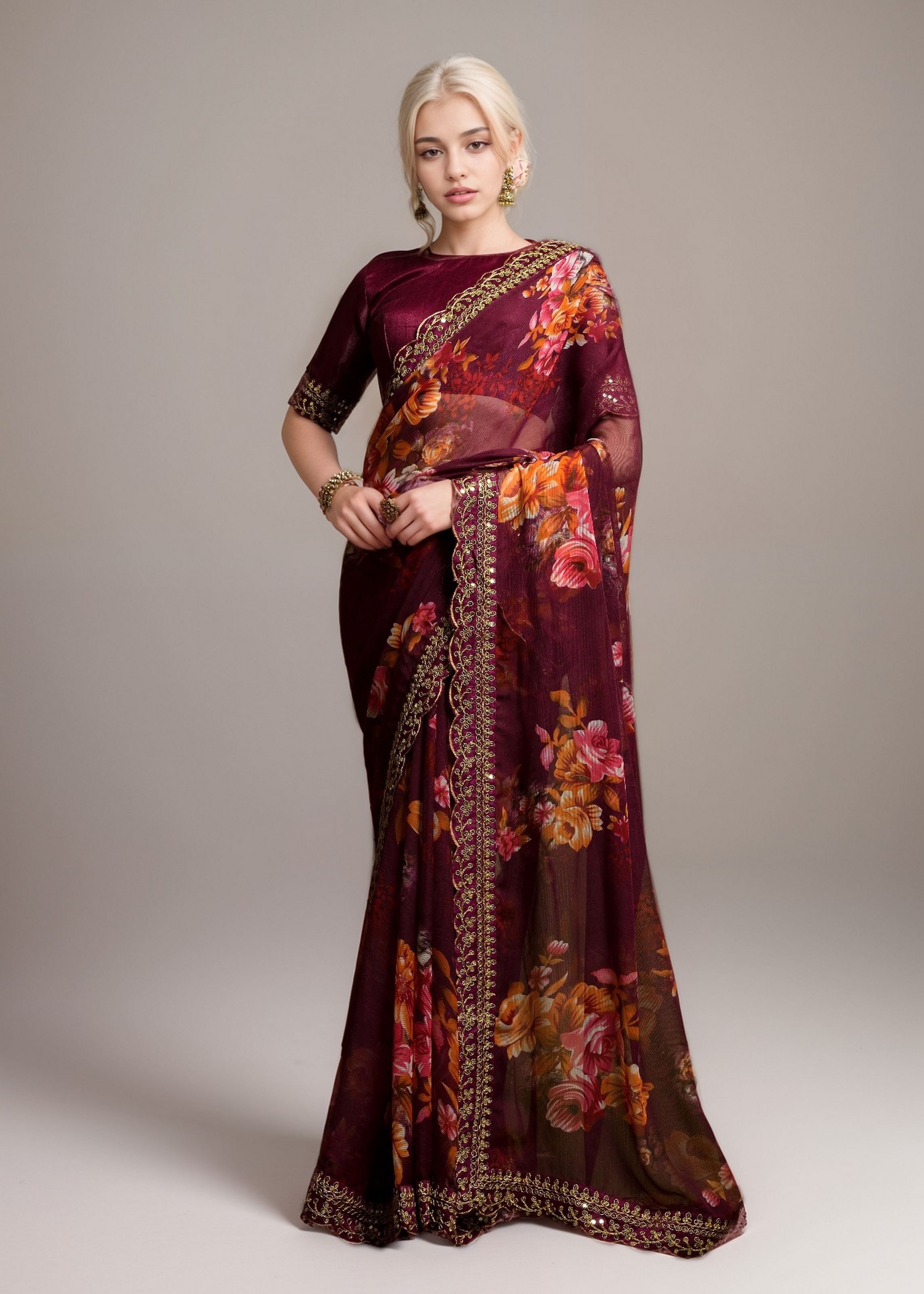 Looking for affordable party wear sarees or designer sarees online? This wine georgette saree is your ideal pick for a chic yet traditional look. Plus, we provide blouse stitching for just $1, so you can achieve a perfect fit without any hassle.Shop from our exclusive collection of printed georgette sarees, embroidered sarees, and more. Enjoy worldwide shipping with fast delivery, especially to destinations like the USA. Elevate your ethnic style with this stunning saree and make every occasion memorable!