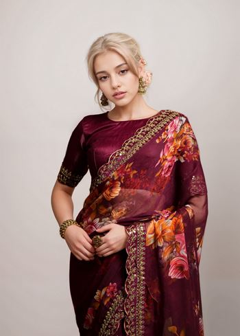 Wine Georgette Floral Printed With Embroidered Border Saree