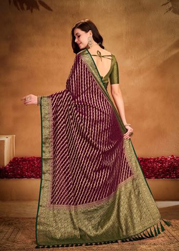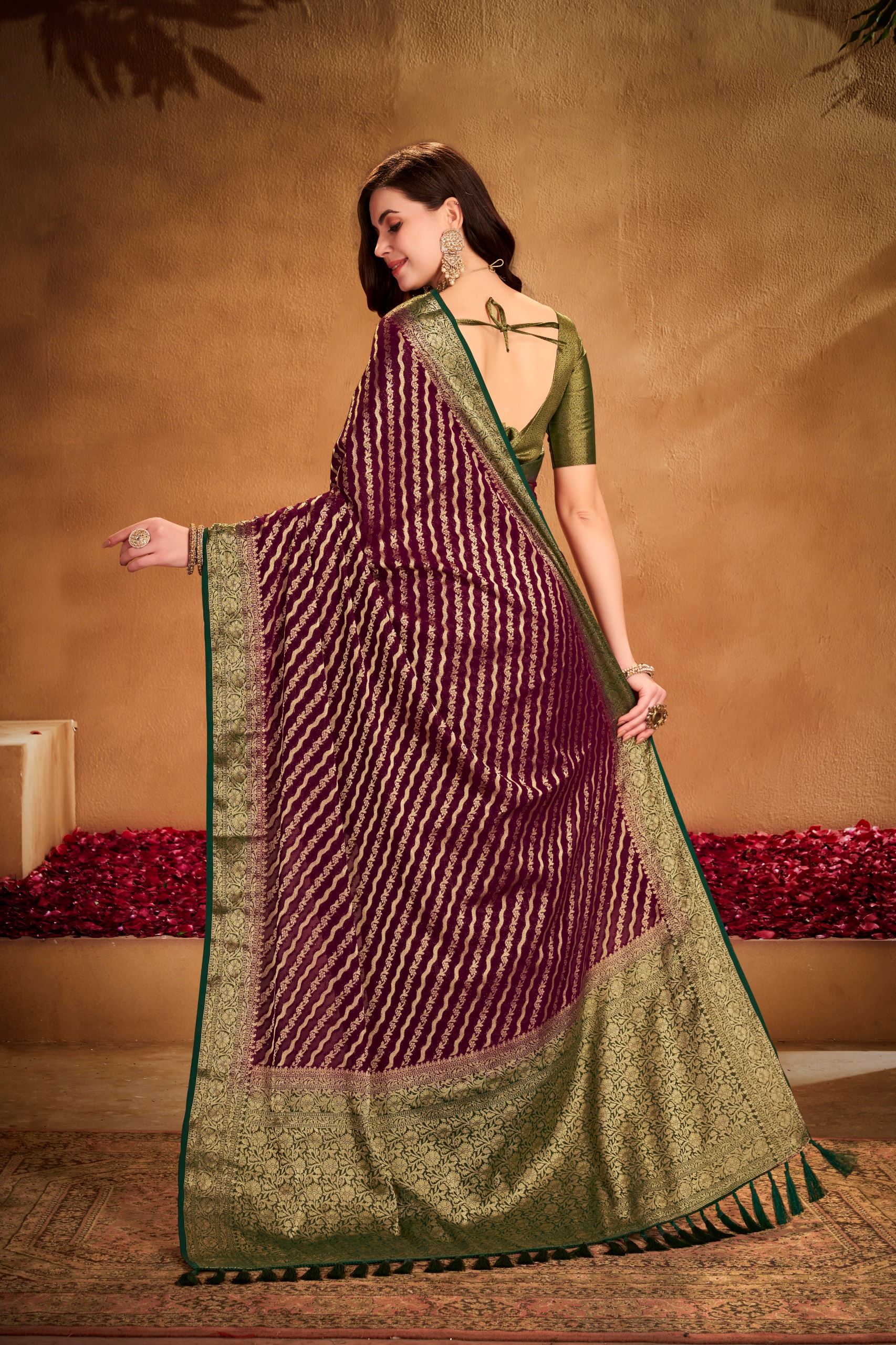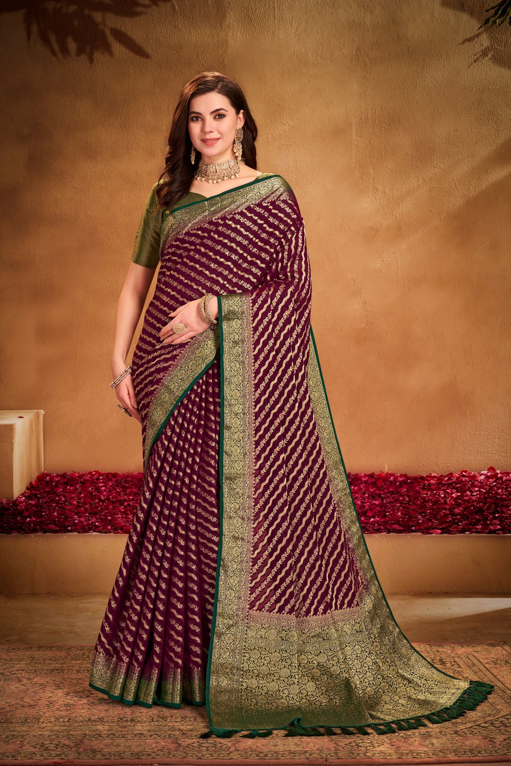 The saree is highlighted with exquisite woven detailing, reflecting skilled artistry that enhances its overall designer look. Adding to its charm is the contrasting green blouse, designed in matching georgette fabric, which creates a striking combination and balances the richness of the wine shade with refreshing vibrance. This pairing not only makes the saree versatile but also ensures it stands out effortlessly in any crowd.
