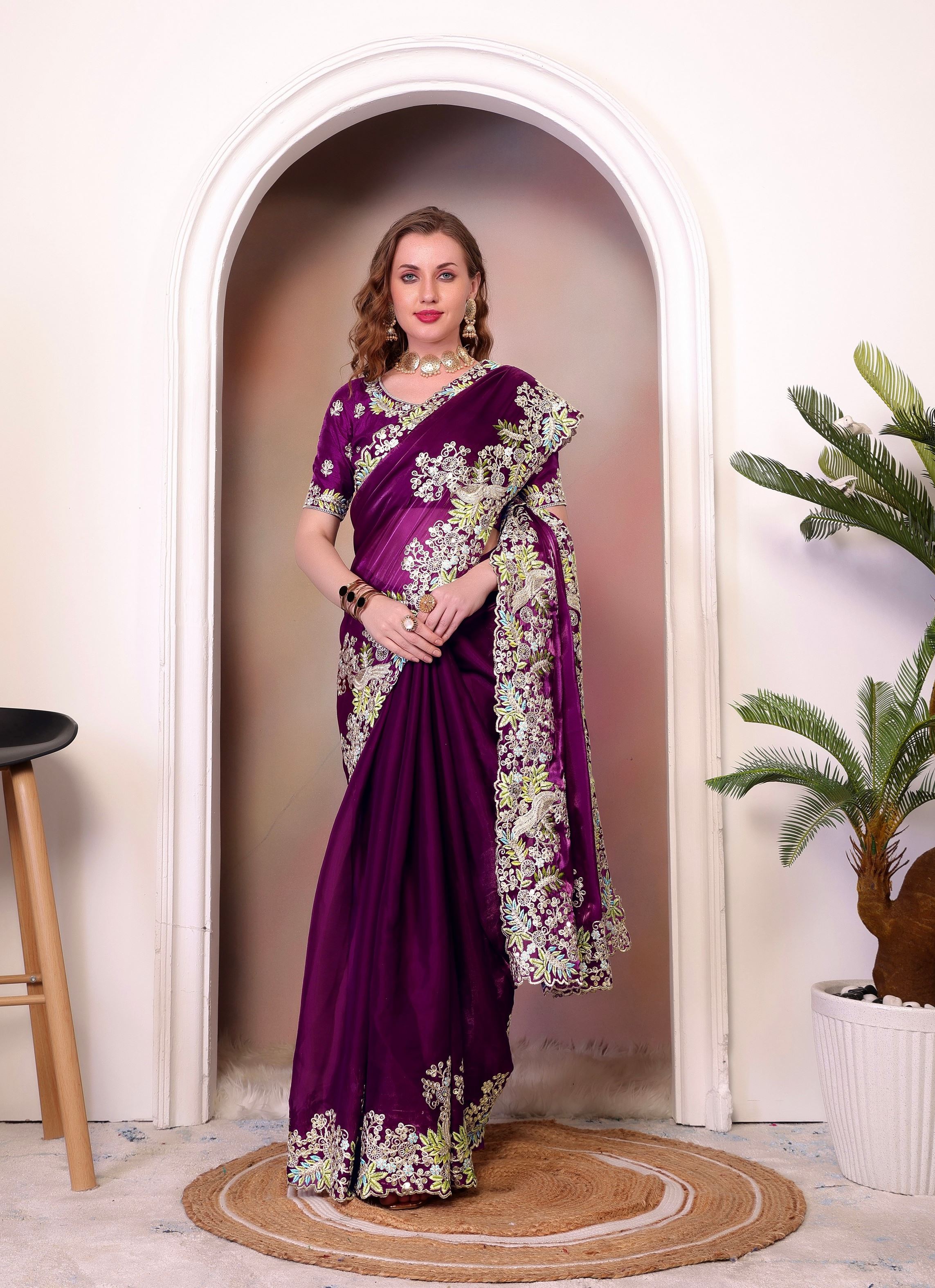 The rich wine color paired with heavy sequins embroidery creates a dazzling effect, ensuring you stand out at any event. Each detail is intricately designed to add a shimmering glow to your ensemble. The saree comes with a matching art silk blouse in wine, complementing the overall aesthetic. You can customize the blouse with stylish cuts or traditional patterns to enhance your look.