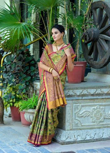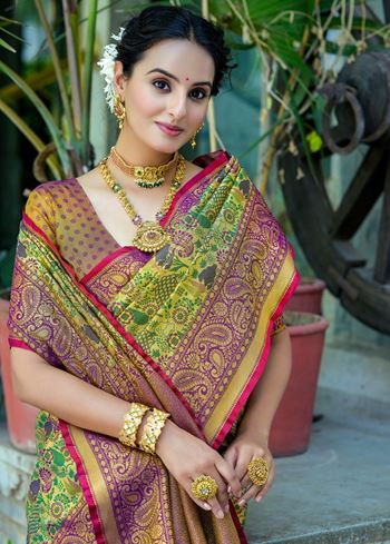The saree features exquisite zari-woven motifs that add depth and shimmer to its elegant drape. Traditional patterns come alive with every thread, while the grand pallu, finished with ornate zari work, enhances the ensemble with a regal finish. Paired with a contrasting mahendi green Kanjivaram silk blouse, it introduces a rich interplay of colors that exude festive opulence.