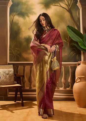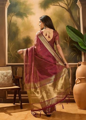 Wine Khadi Organza Woven Jacquard Designer Ethnic Partywear Saree