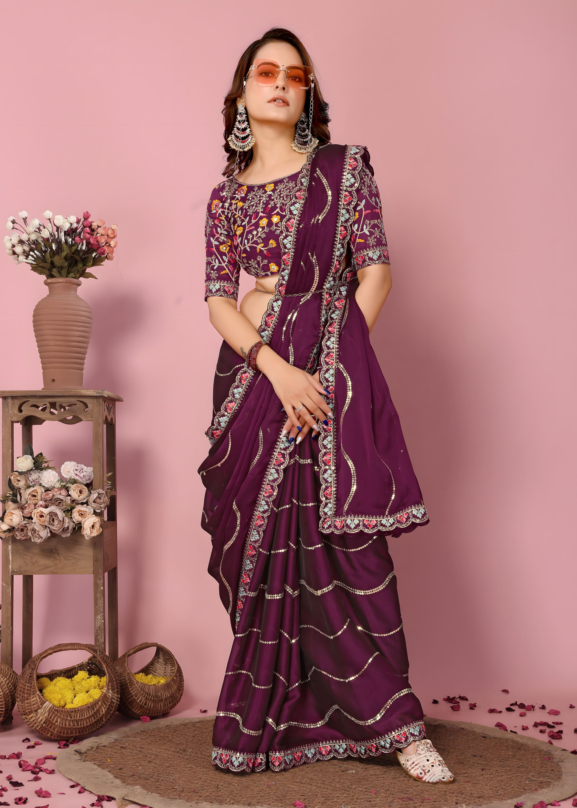 Wine Rangoli Silk Saree with Embroidery cut work Lace with sequence work