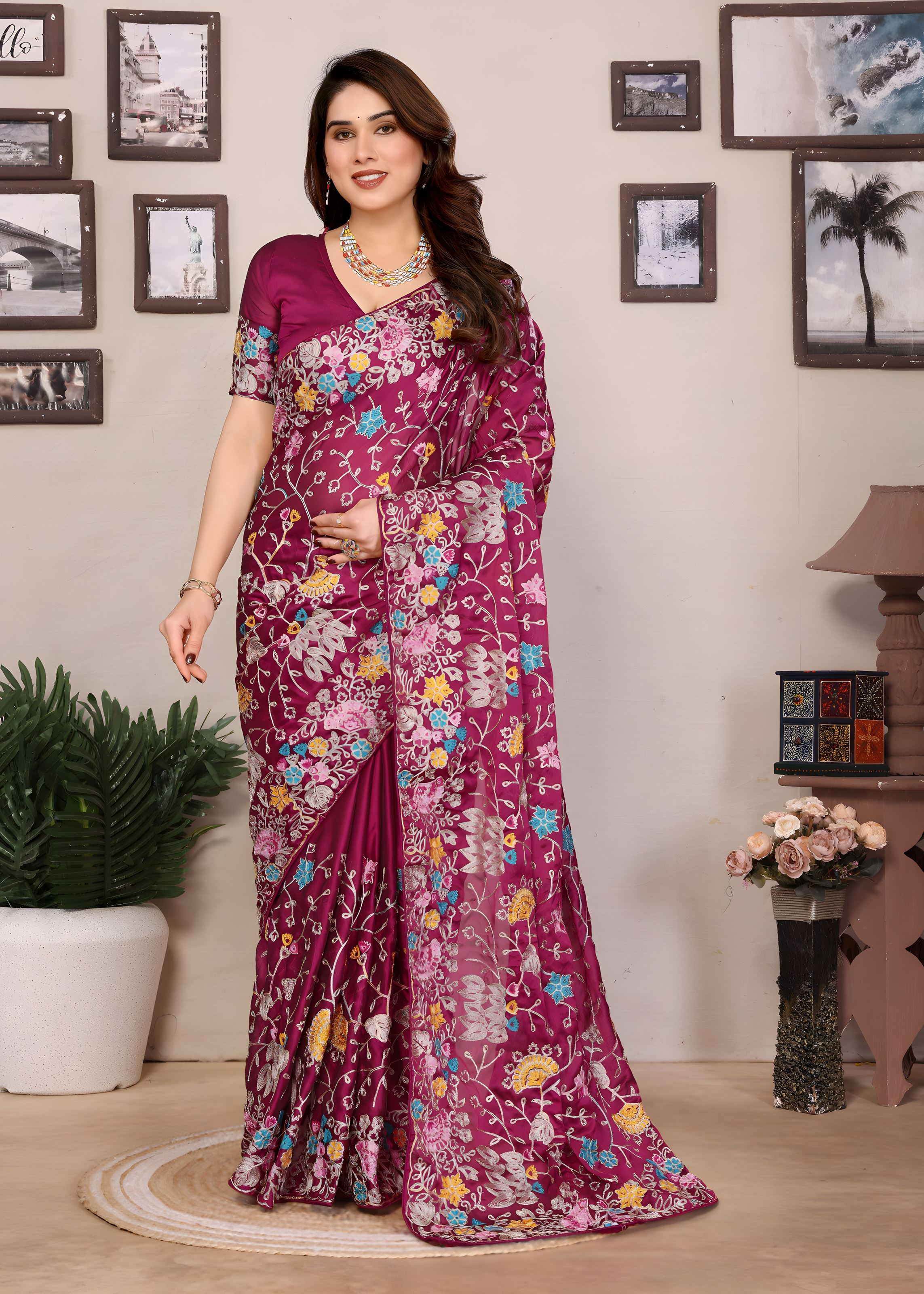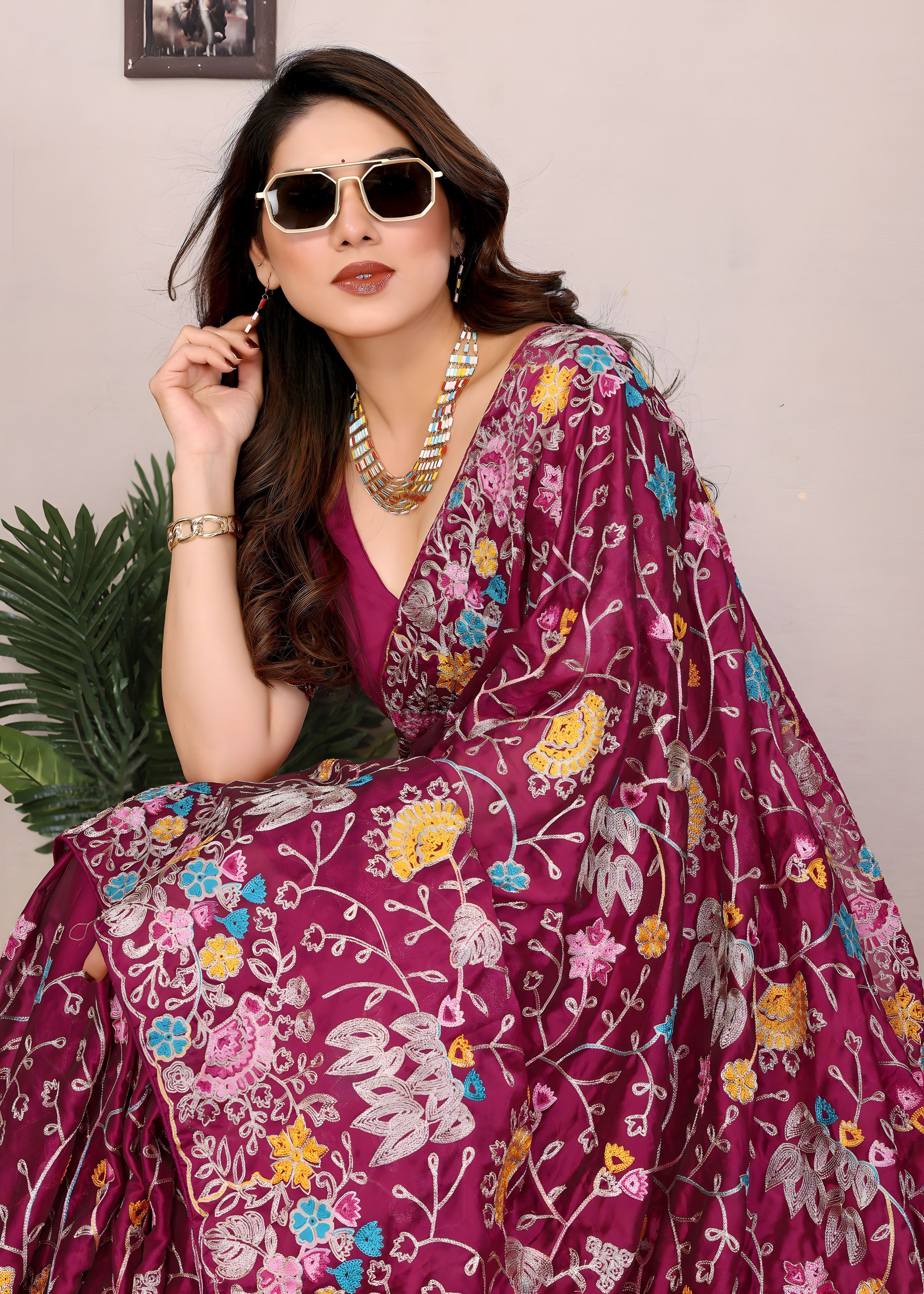 Wine Rangoli Silk Saree with Embroidery with piping border Work