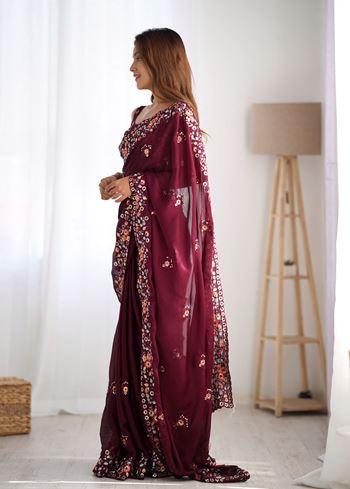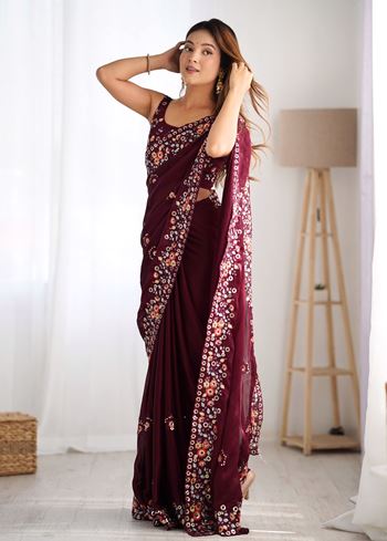 Wine Satin Chiffon Fabric Designer Thread And Sequins Work Partywear Saree