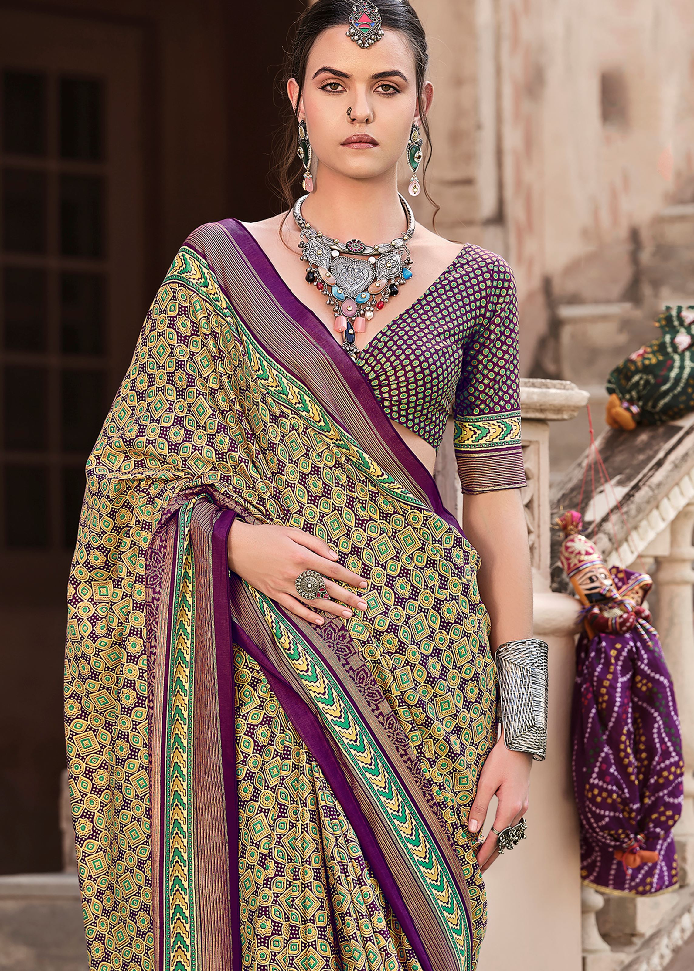 Wine Silk Saree With Ajrakh Print