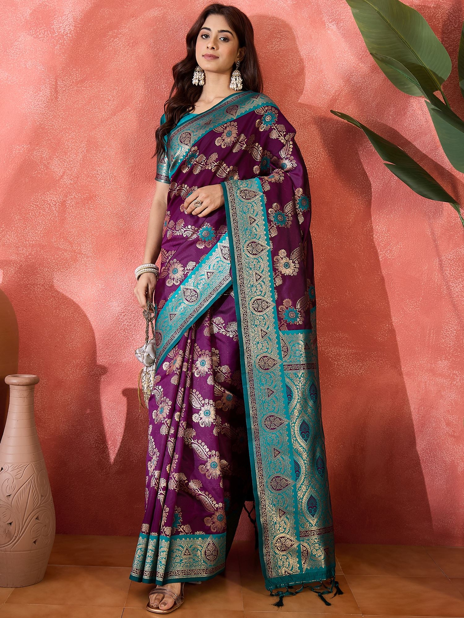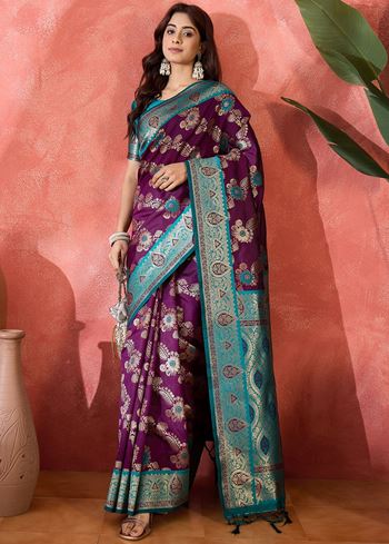 Style this saree with traditional jewelry like gold or kundan sets, a matching clutch, and high heels for an effortlessly glamorous look. Perfect for receptions, festive pujas, or any special gathering, this saree ensures you leave a lasting impression with elegance and poise.Add this wine silk woven partywear saree to your ethnic collection and experience the perfect blend of luxury, tradition, and contemporary fashion.