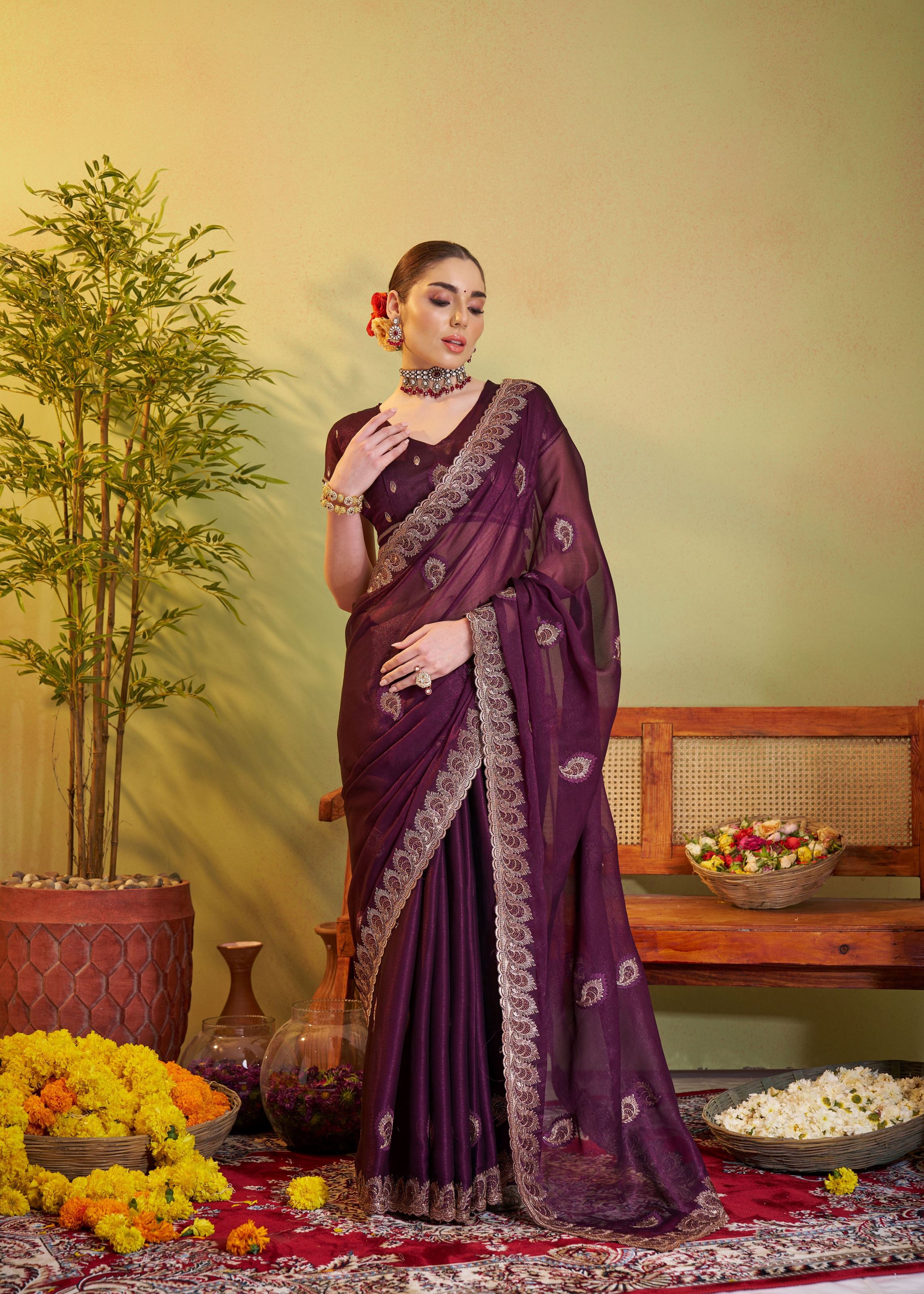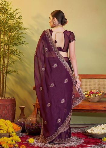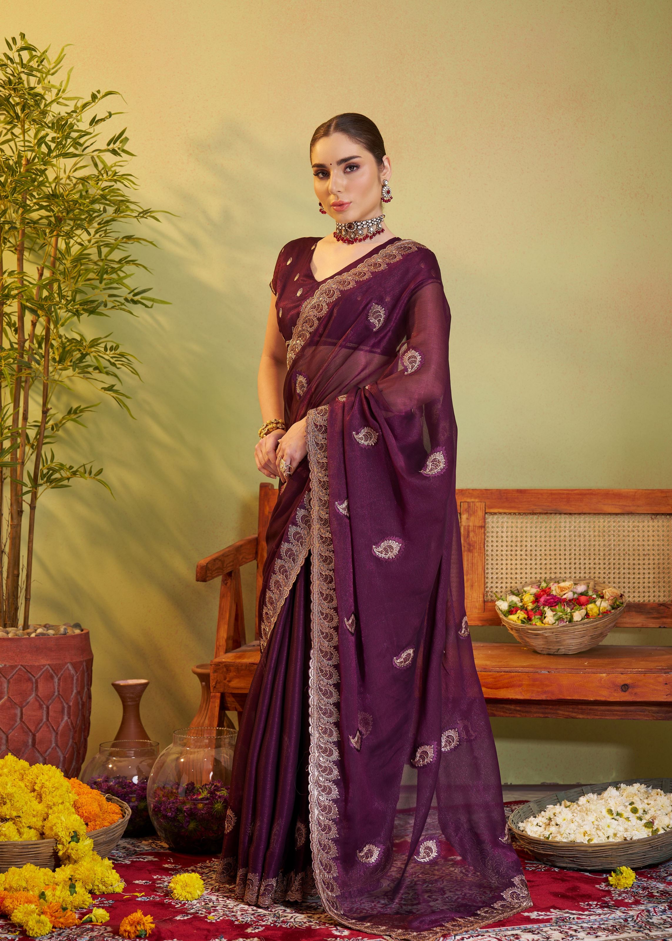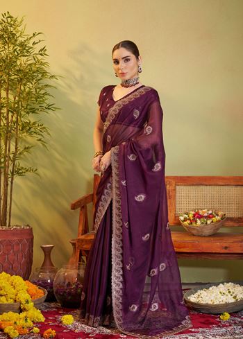 Wine Sitara Chiffon Designer Partywear Saree For Rich Indian Looks