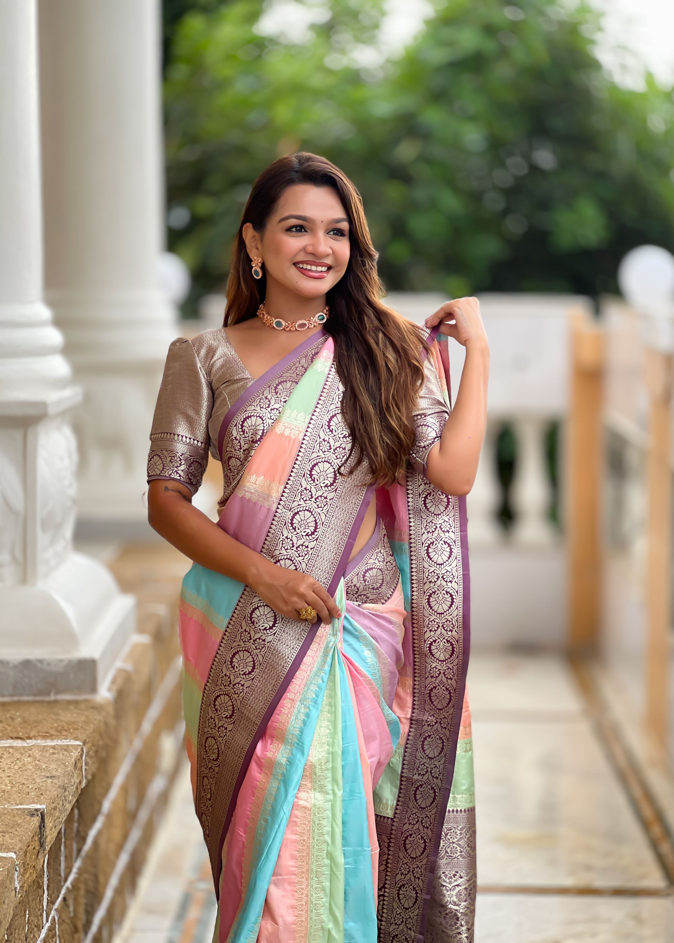 This saree features intricate woven Jacquard work, adding depth and beauty to the overall design. It comes with a matching wine silk blend blouse, allowing you to style it seamlessly for weddings, festivals, and traditional gatherings. The superior weaving technique guarantees durability and a flawless finish, making this saree a must-have for your ethnic collection.