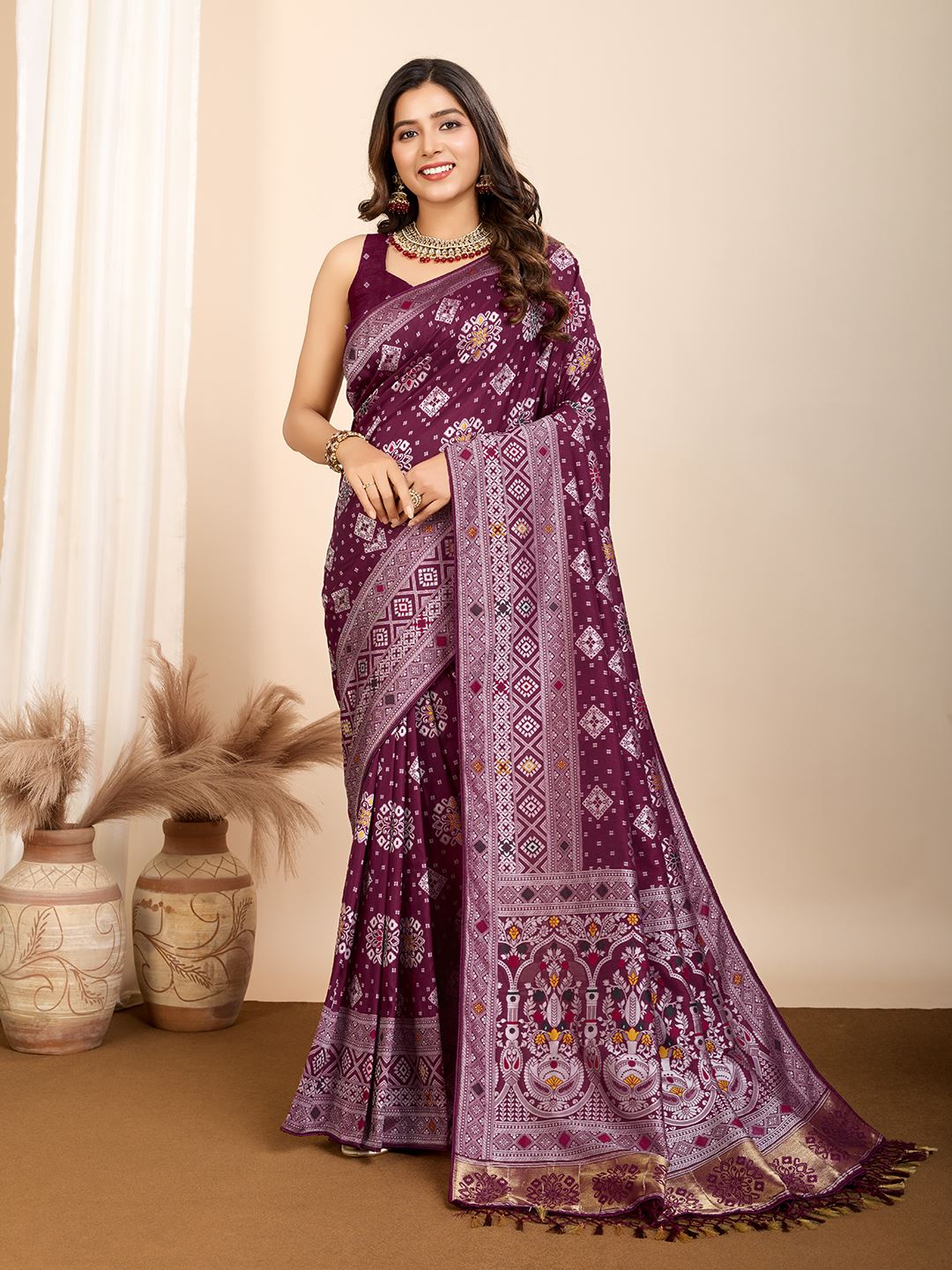 The saree comes with a matching silk blouse in wine, creating a seamless and elegant ensemble. The woven artistry showcases traditional craftsmanship while giving it a contemporary appeal, making it ideal for weddings, receptions, festive gatherings, and grand celebrations. Its lightweight yet premium silk fabric ensures both comfort and luxury, allowing you to move with ease while making a lasting impression.