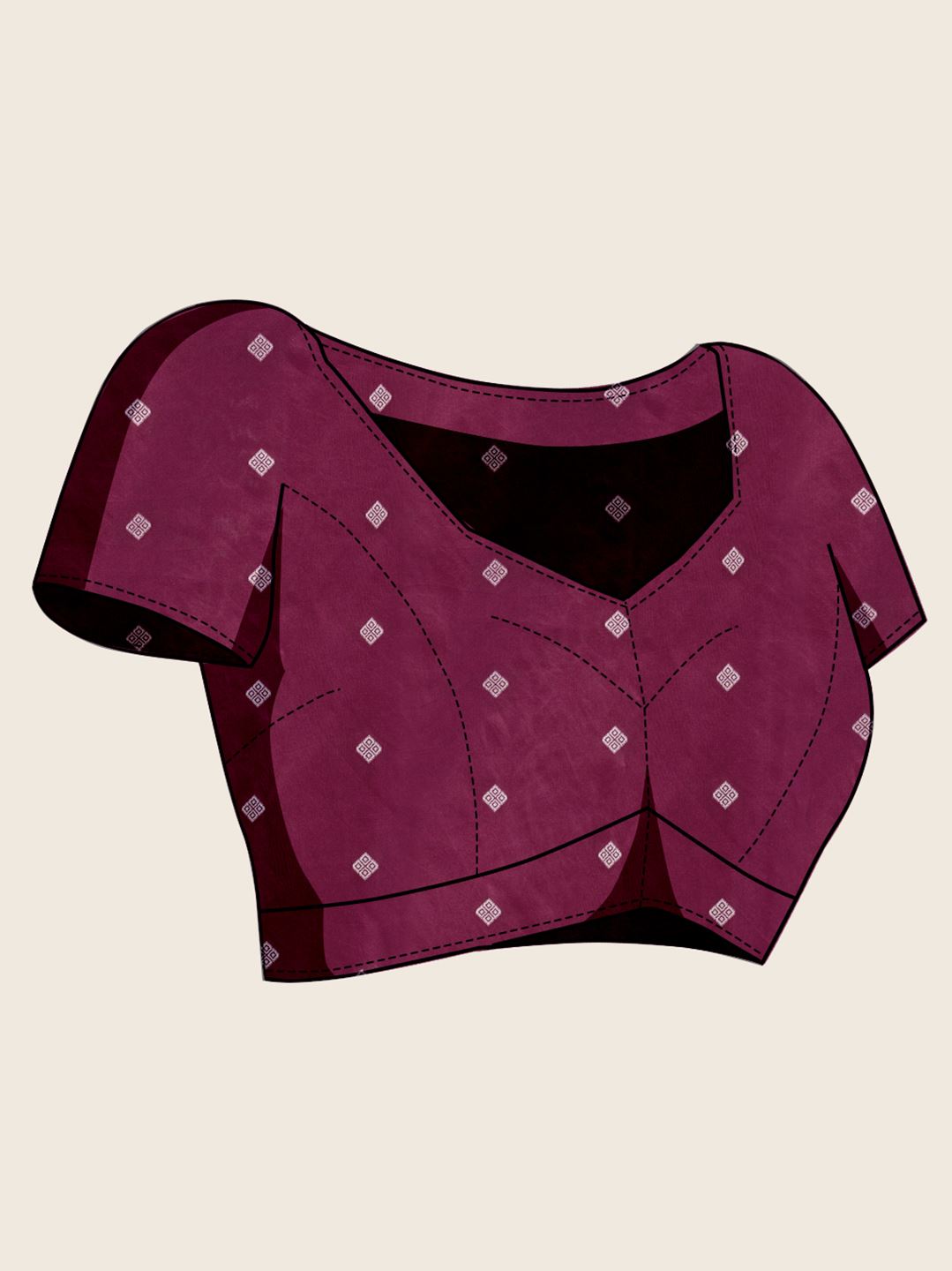 Paired with a matching silk blouse in the same wine shade, the ensemble achieves a harmonious and refined look. The blouse fabric allows for versatile styling—whether you prefer a classic traditional stitch or a contemporary cut, it will complement the saree beautifully.