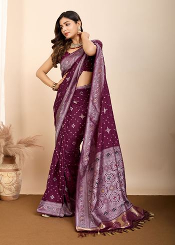 Wine Soft Silk Woven Meenakari Designer Ethnic Saree
