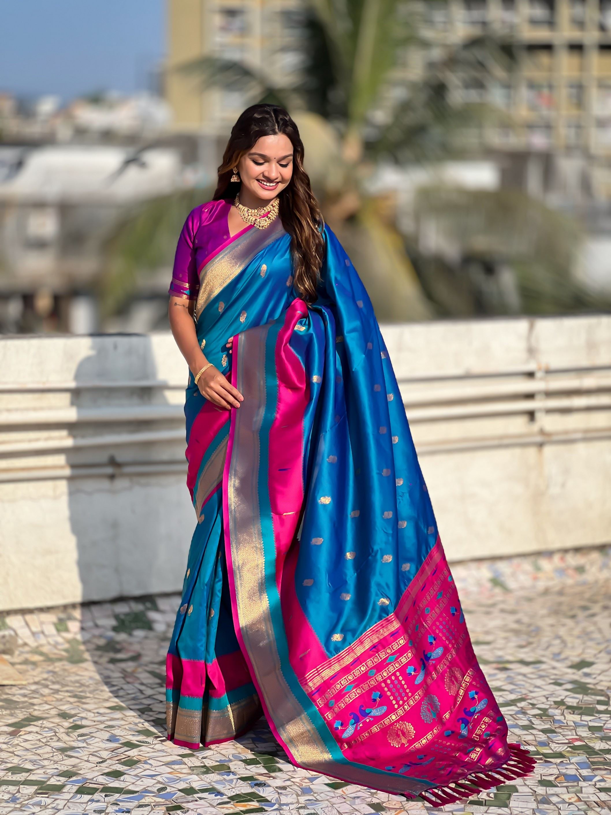 Paired with a contrasting purple silk blend blouse, the ensemble strikes a striking balance of elegance and vibrancy. This royal color combination enhances your look, ensuring you stand out with grace and style.Complete your traditional attire with gold jewelry, a sleek bun adorned with flowers, and classic makeup to complement the saree’s timeless beauty. Lightweight yet exquisitely rich in detail, this Paithani silk saree is not just an outfit—it’s a statement of tradition and sophistication.
