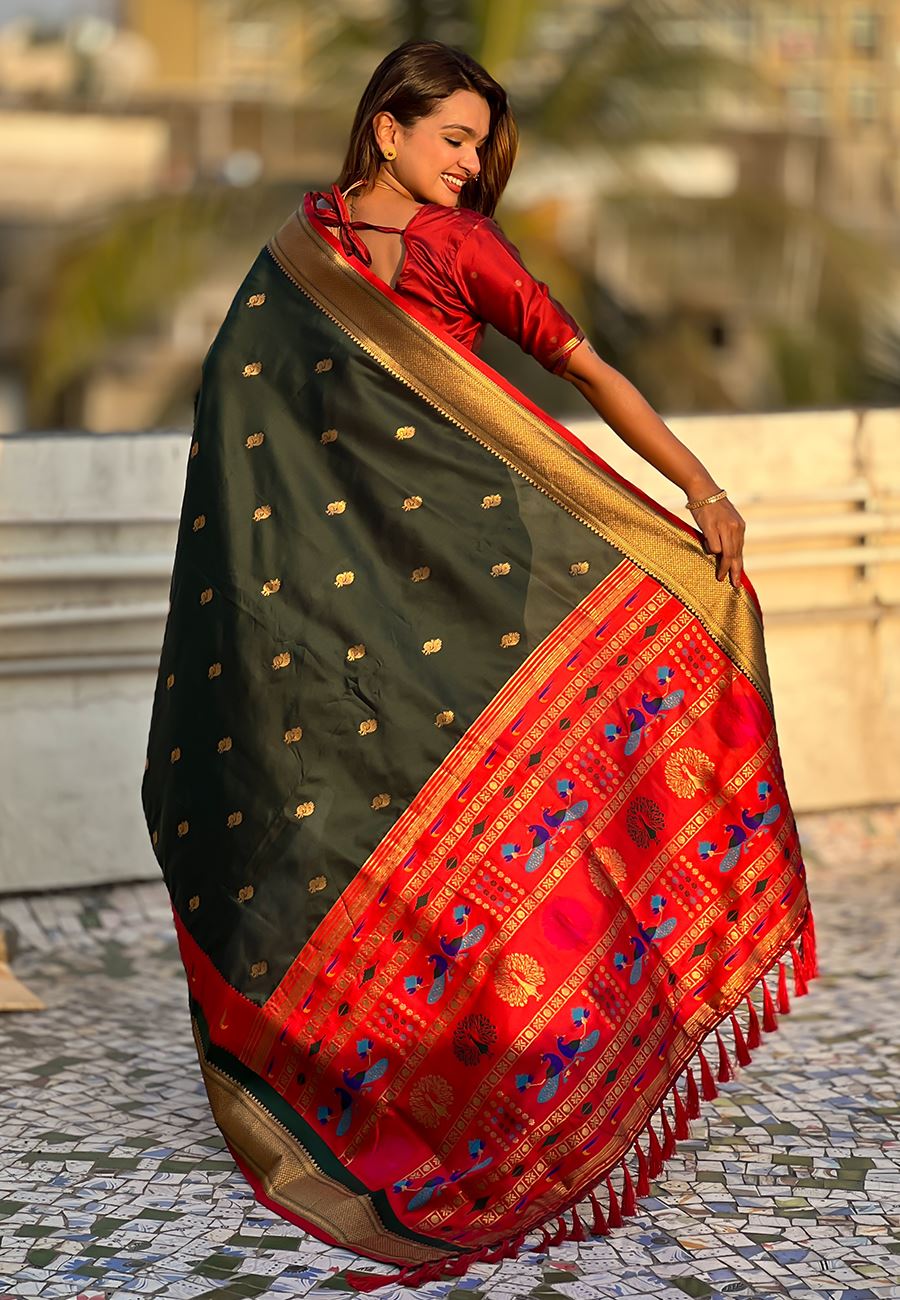Woven Gold Jari Peacock Designer Green Paithani Silk Ethnic Saree